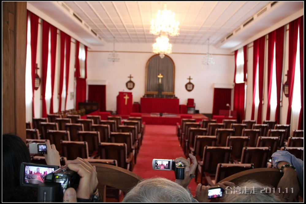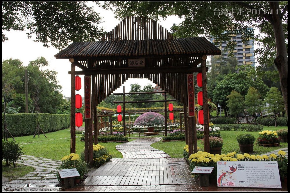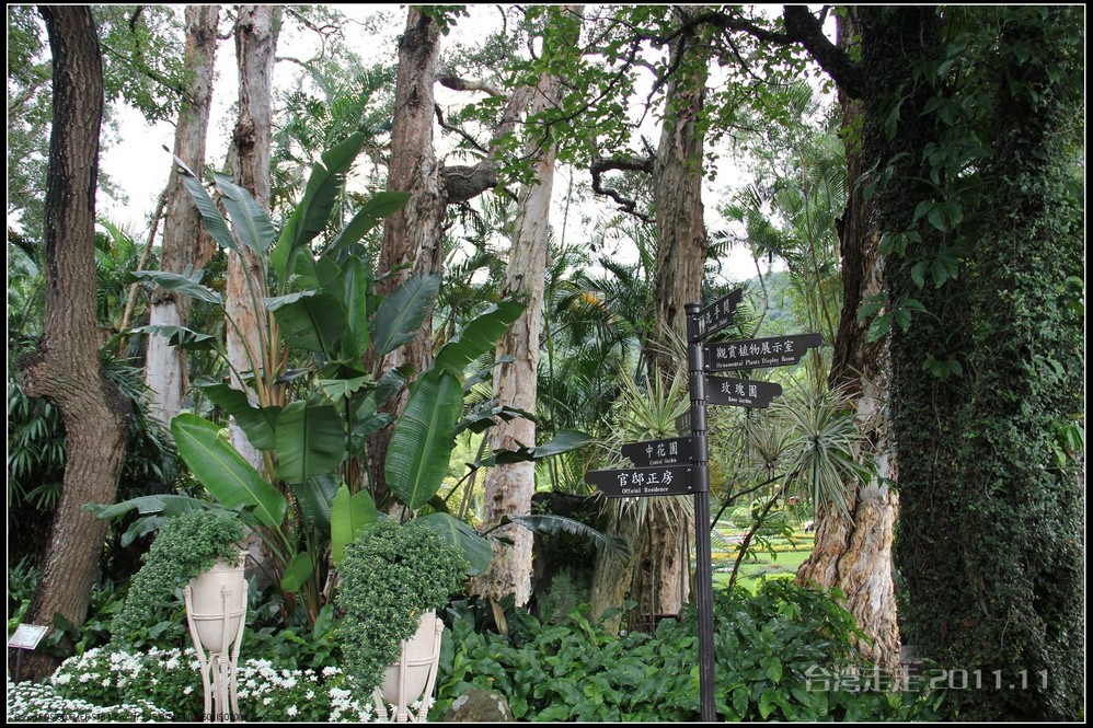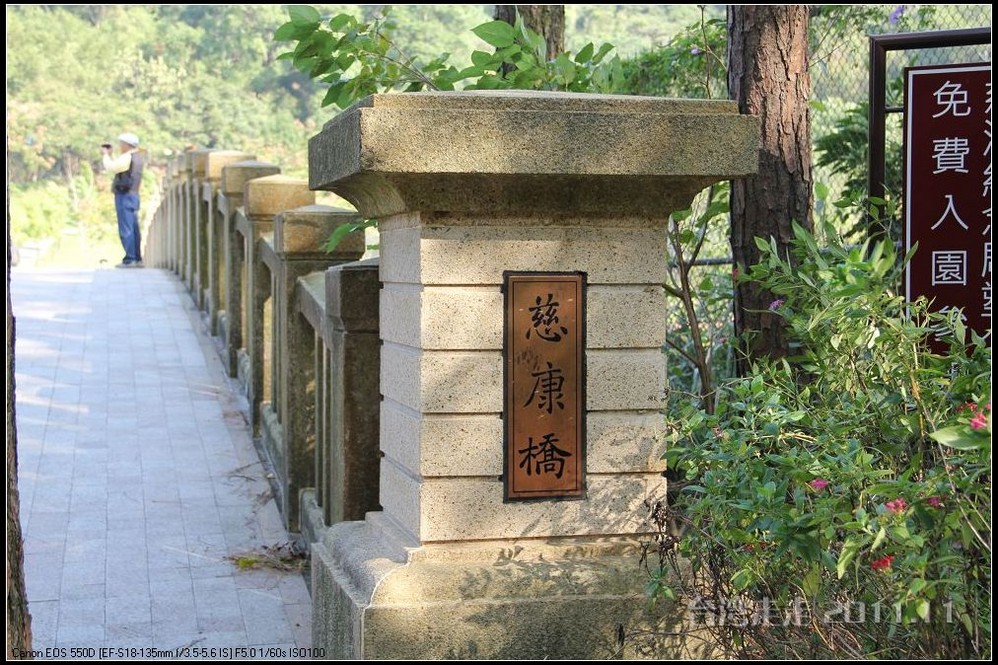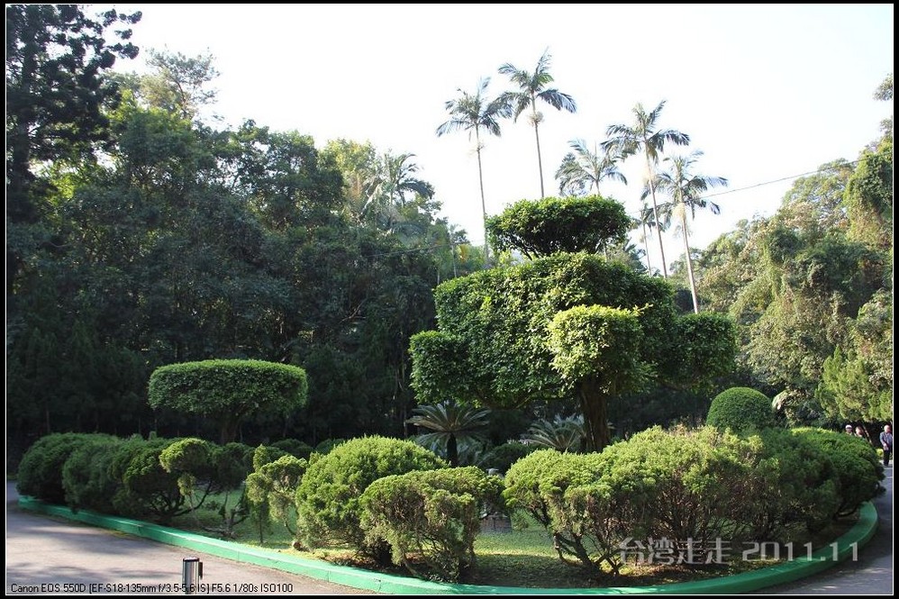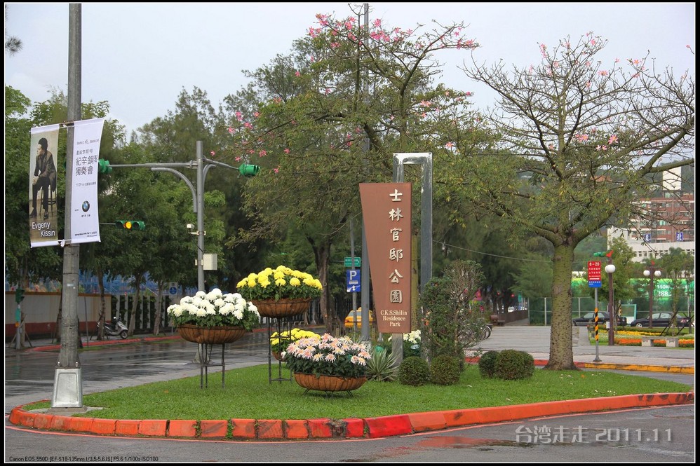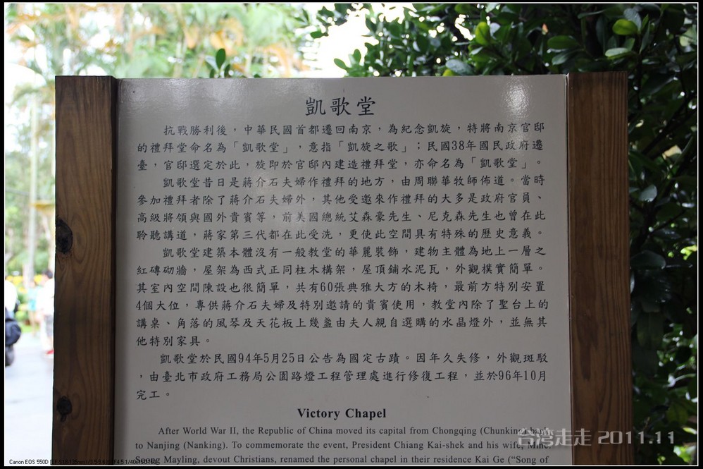 士林官邸 位于台北市士林区福林路,早期蒋氏夫妇住处,目前为台北 市一座生态公园。现只保留私人别墅 一栋,其余皆开放民众参观,包括:士林园艺所、园艺展览馆、欧式花园、中式庭园、兰亭与喷泉,及作礼拜的凯歌堂,外花园有温室盆栽和玫瑰园,内花园为中式庭园和西式式庭园的合称,有假山奇石造景,花木扶疏丝荫遮天,在艳阳高 照下,可让你清凉一下!又可享受席地而坐聆听演奏,一种不拘形式的音乐飨宴。官邸从民国三十八年动工兴建,于三十九年初完工落成。蒋介石来台后,先居于草山(阳明山)行馆,士林官邸 落成后的1950年5月,蒋介石正式迁居士林官邸 ,直至民国六十四年(1975年)病逝,在官邸度过了整整26年的时光。官邸出口处有一座咖啡馆,很多人都坐在咖啡馆门口的露天吧区内休憩闲谈,咖啡馆的招牌是一张很大的黑白照片,照片上身穿婚纱的宋美龄和西装革履的蒋介石含笑相依,这是1927年12月1日蒋介石与宋美龄在上海 大华饭店举行的世纪婚礼上的照片。 那场“世纪婚礼”震惊了当时的旧中国 ,也使整个世界为之侧目,历史学家们把这一婚姻形容为权力与财富的结合,象征着旧中国 从此进入“蒋宋孔陈”四大家族统治的时期。咖啡馆里有各种纪念品卖,刚一接触台币的价格,看着那好几百上千的数字,脑袋还不太转得过来,就是感觉贵,忍了,什么也没买。后来想想咖啡还是应该买上一杯品尝下的。