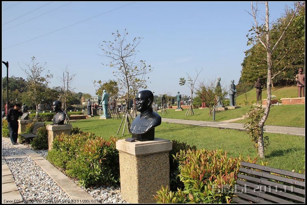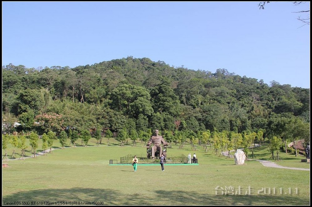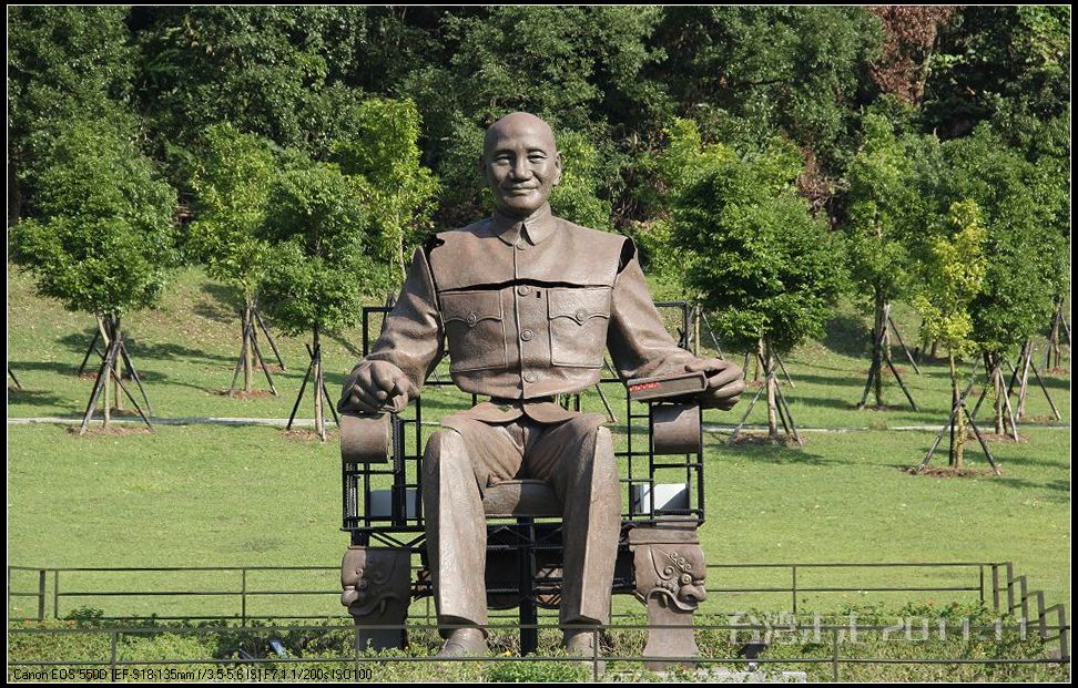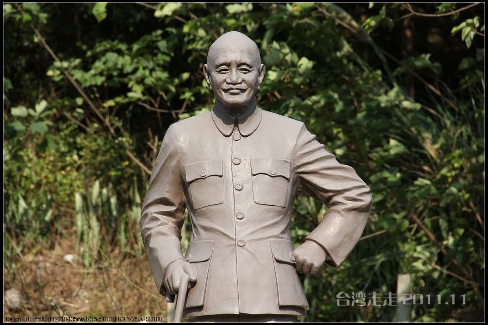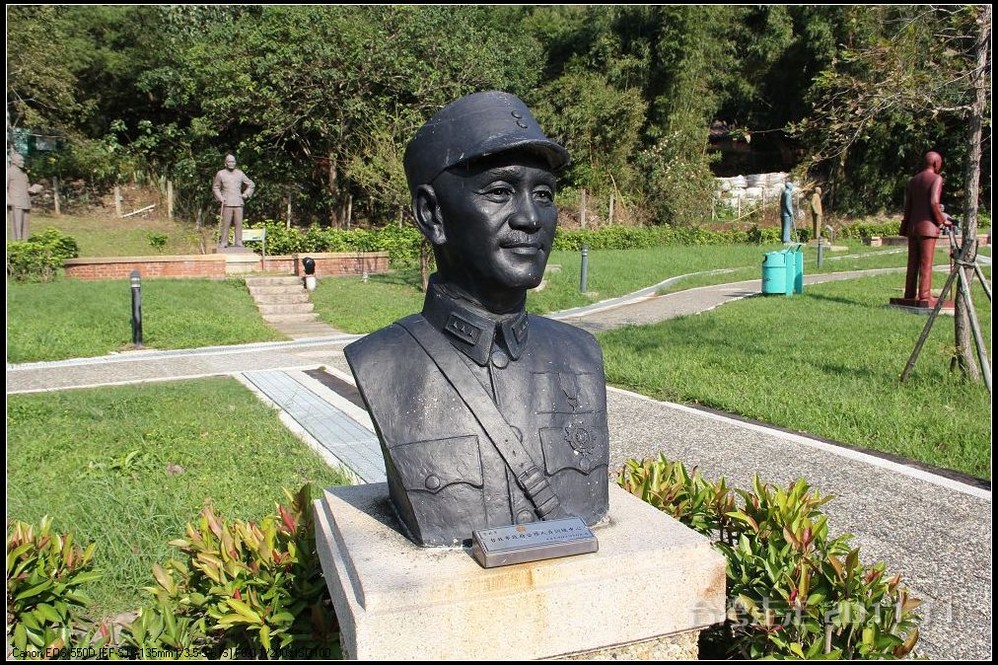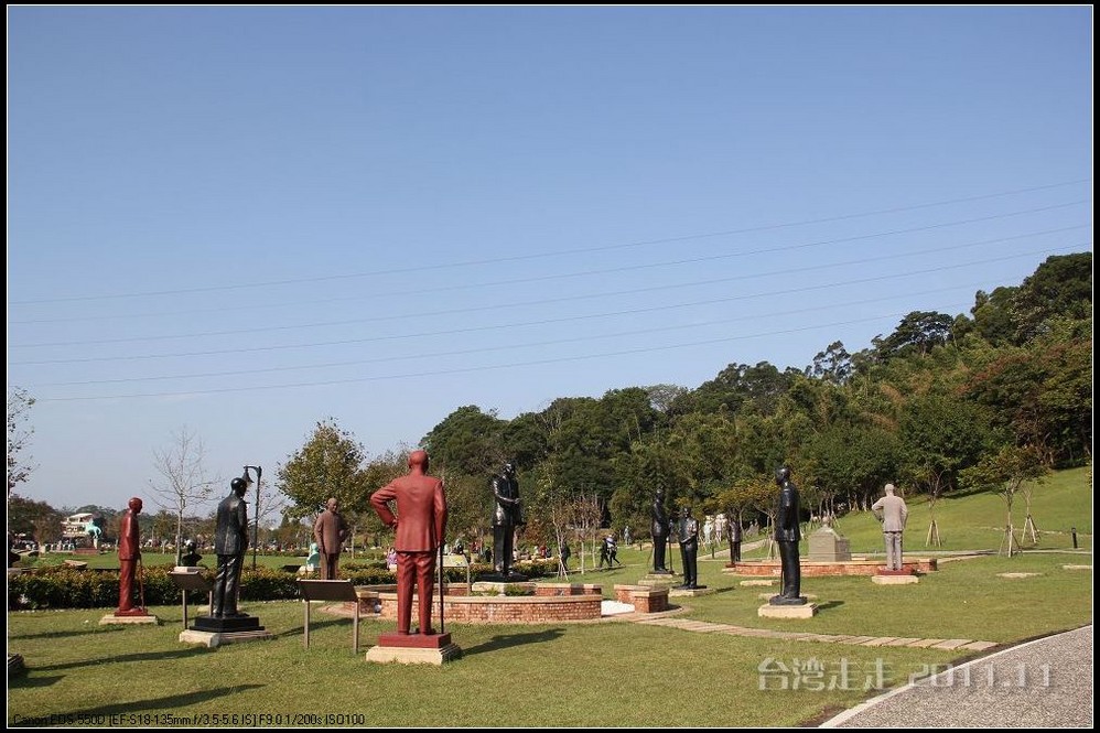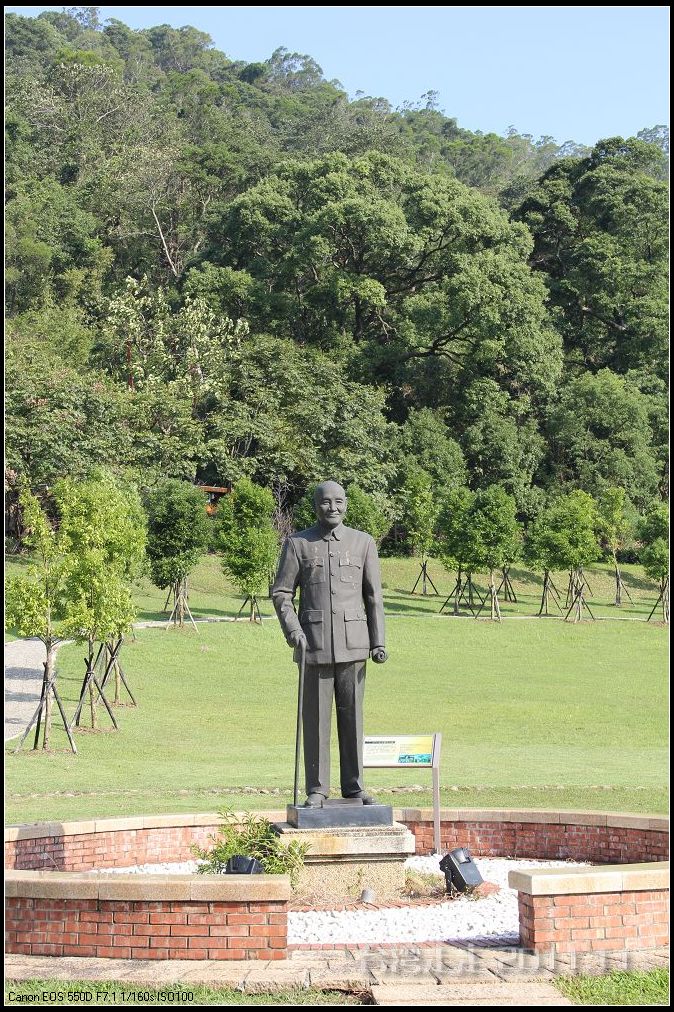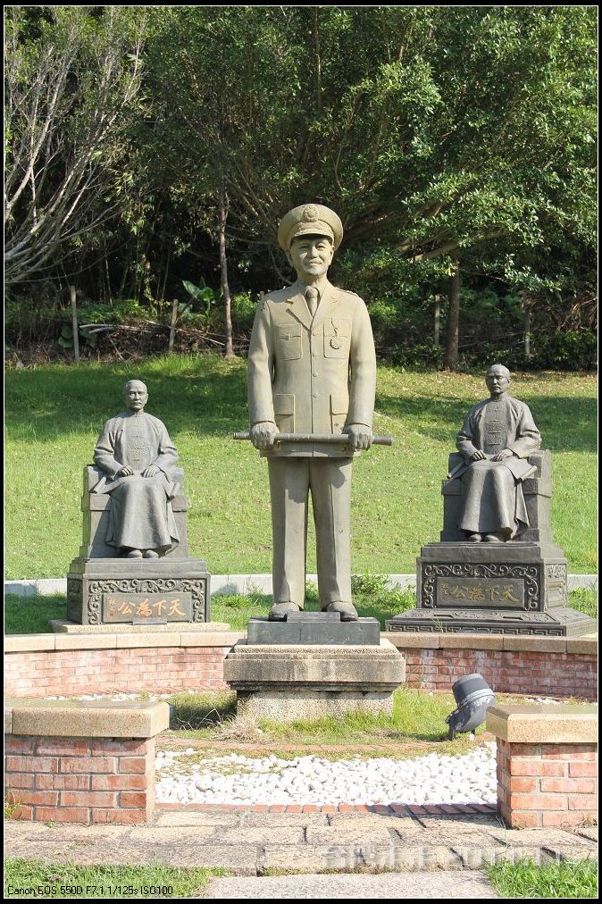 在园区里,走过“慈康桥”,有很多老蒋的雕像,听说是陈水扁上台后,把各处摆放的“老蒋”全搬到这里来了,足有一百五十多件。有老蒋不同年龄、不同装束的,有站着的、坐着的,还有略带罗锅柱着拐棍的呢。集中一次能看到这么多的“老蒋”,也挺有意思。其中也有个别两、三座是孙中山 的雕像。
