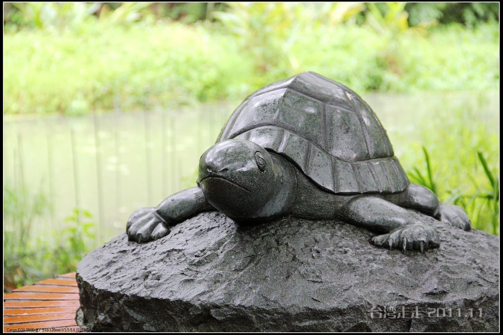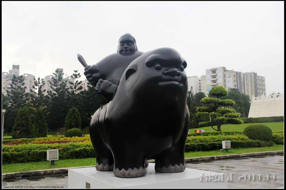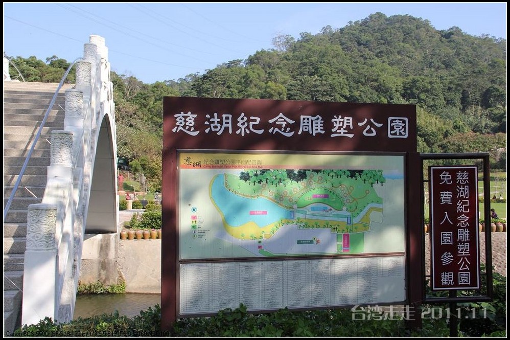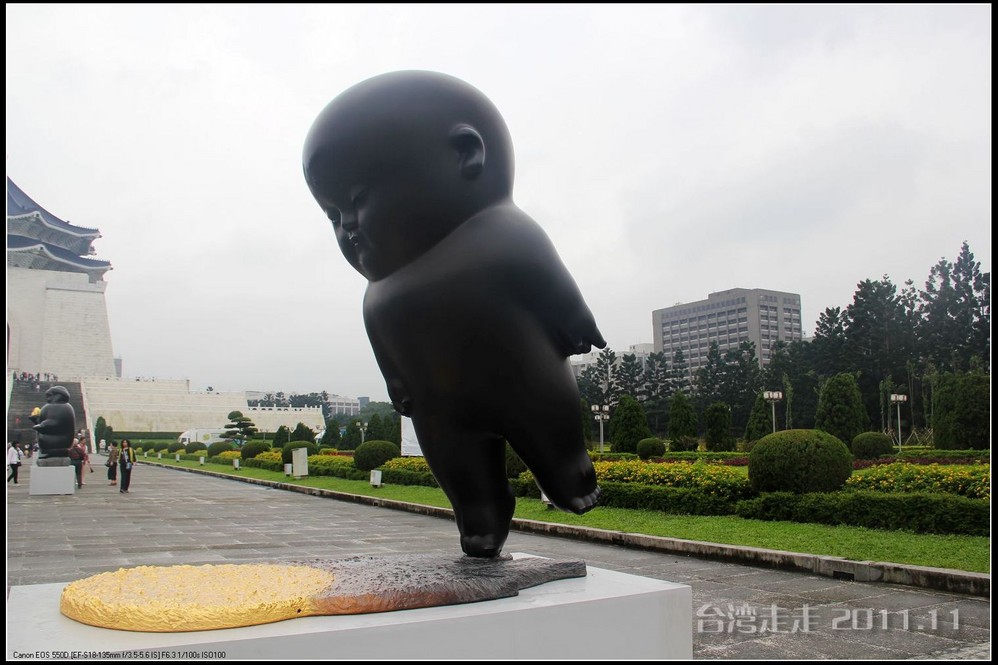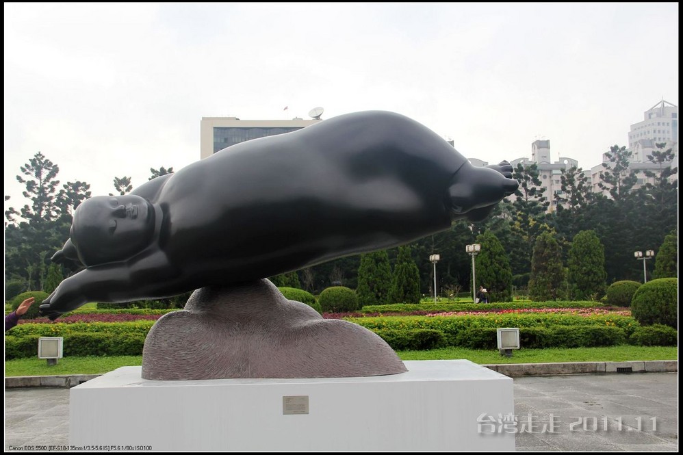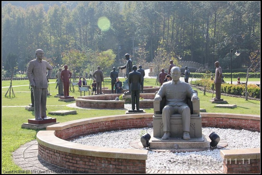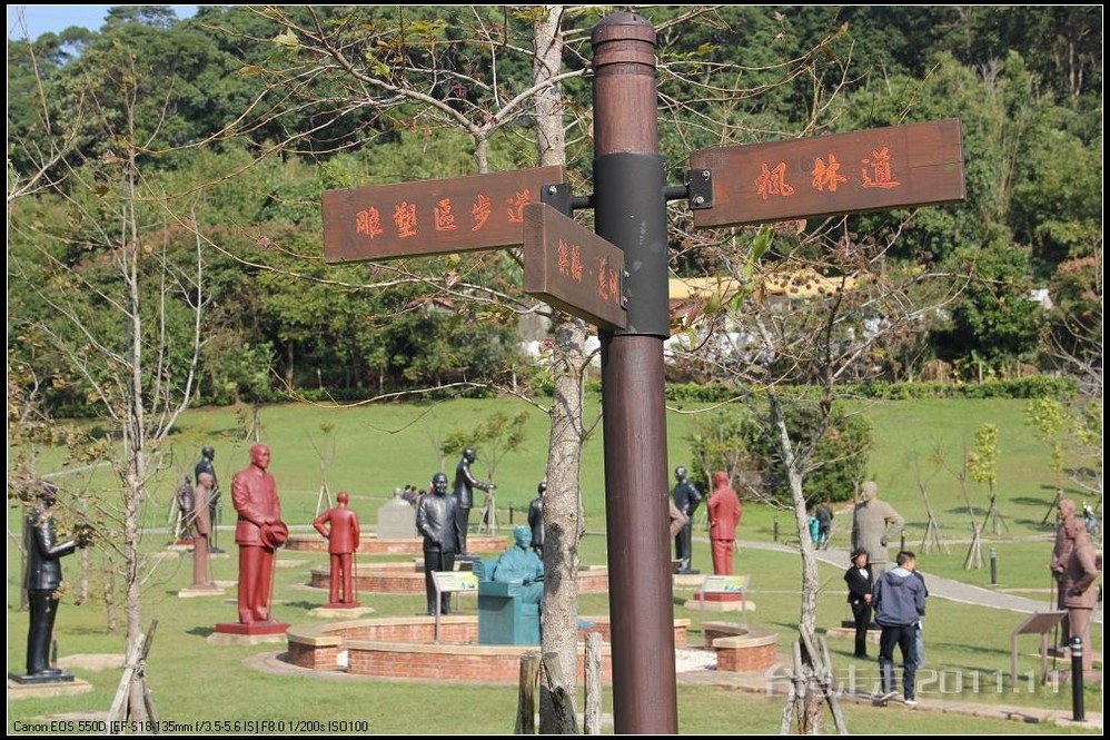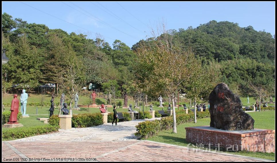 在园区里,走过“慈康桥”,有很多老蒋的雕像,听说是陈水扁上台后,把各处摆放的“老蒋”全搬到这里来了,足有一百五十多件。有老蒋不同年龄、不同装束的,有站着的、坐着的,还有略带罗锅柱着拐棍的呢。集中一次能看到这么多的“老蒋”,也挺有意思。其中也有个别两、三座是孙中山 的雕像。
