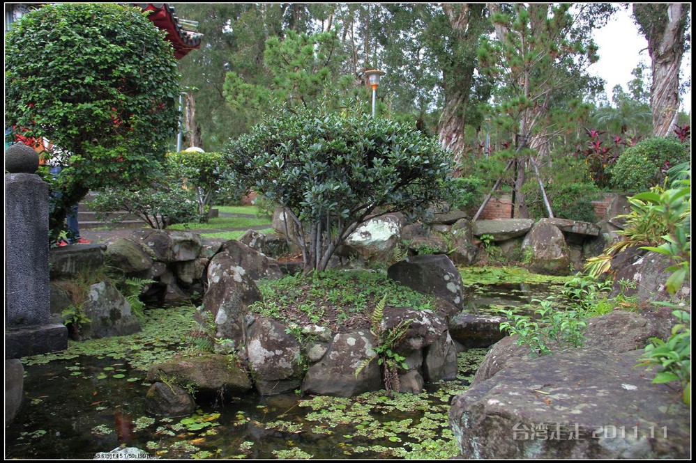 在中台禅寺 中,不会像一般寺庙一样,被点着的香熏得难受。这里是没有香火的,菩萨 周围摆放的都是檀香木来供奉,不能触摸。在殿外的花园里,有个景象到很有趣,很像是杭州西湖的“三潭印月”,只不过是缩小版的。