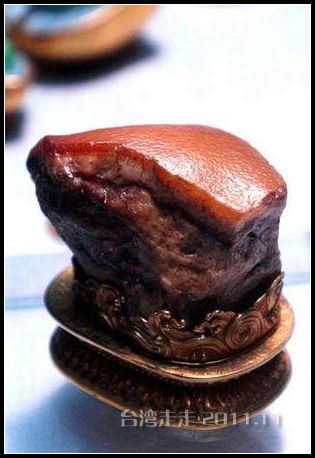 “东坡肉形石”小得只有一个拳头大,乍看之下,到真像是一块令人垂涎三尺、肥瘦相间的“东坡肉”。材质是块黄玉。但它金贵就是那“肉皮”的纹路上,是用针尖那么细的刻刀刻上去的。