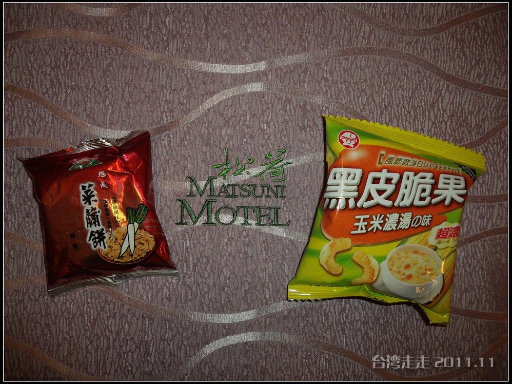 提供的饮料和小食 饮料有两种,一个叫舒跑的运动饮料,味道还好,另一个叫黑松沙士的,我可喝不惯,有股怪味儿。那两种小零食还挺好吃的。两个房间里的:四根香蕉、四个桔子,四听饮料、四包零食,都在未来几天的行程中被我一一消化掉了。
