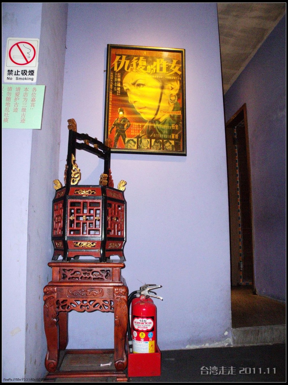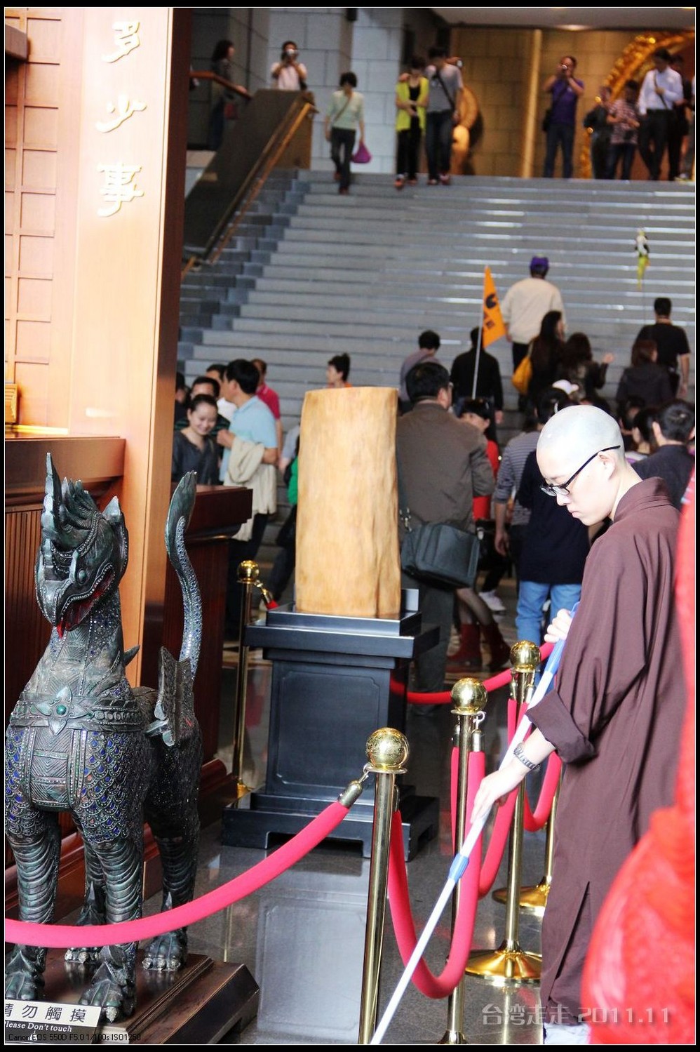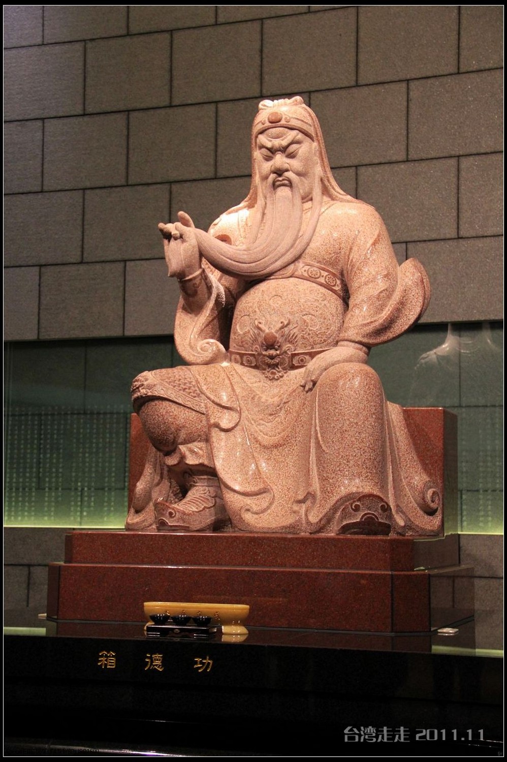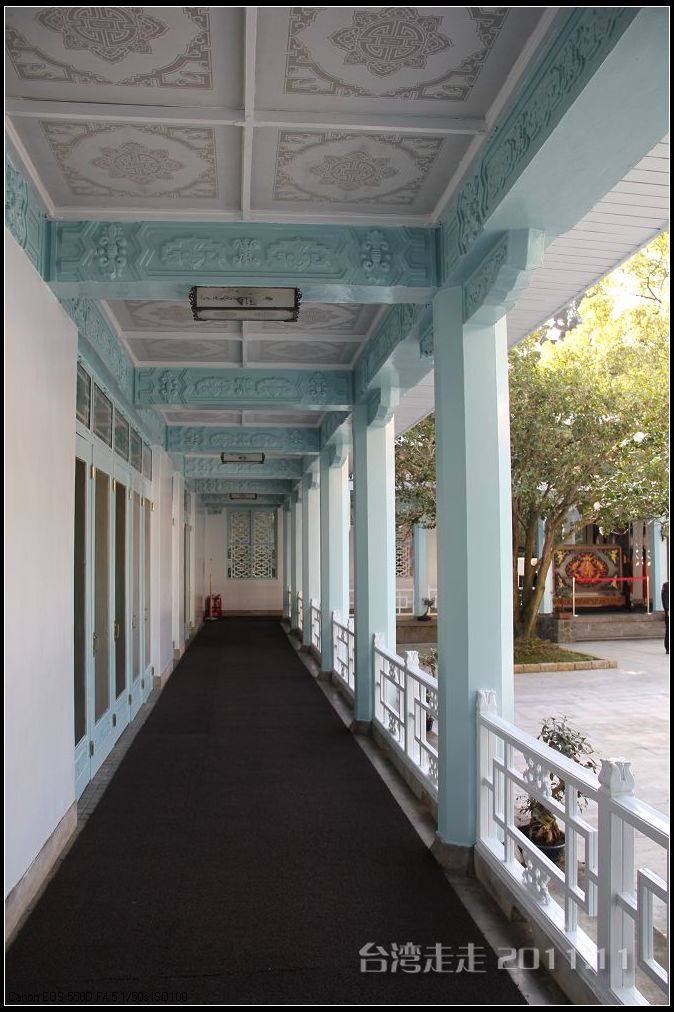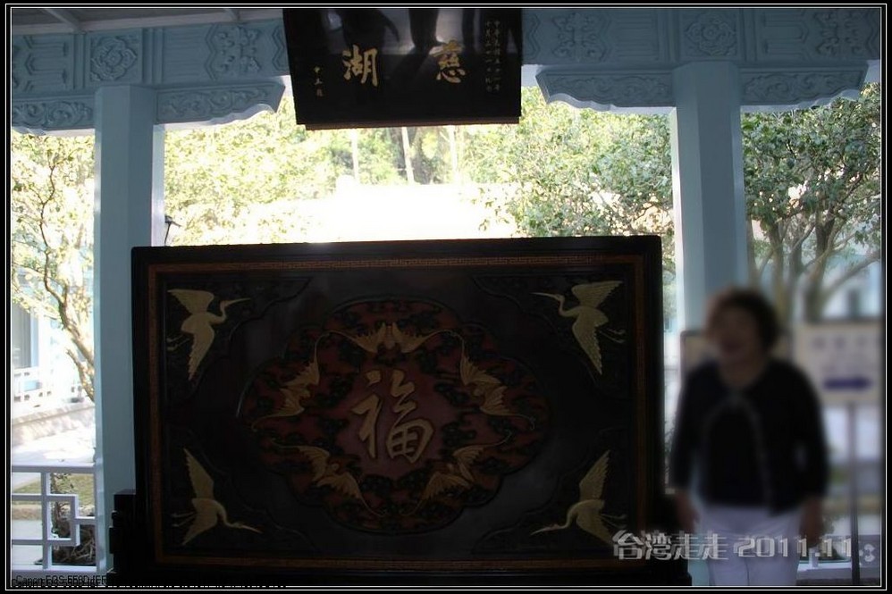 沿湖走进去,阙导带我们来到一座高阶房子前,门口有站得笔直的卫兵,他们是不能动的,可以跟他们照相,但不能碰他们。还有几个黑西服白手套的人在禁示游人喧哗,气氛很紧张严肃的。进门处有一座“福”字屏风,很多人在那里照相。里面是淡水 蓝立柱白色天花板墨绿地毯的回廊,看着到很清爽。
