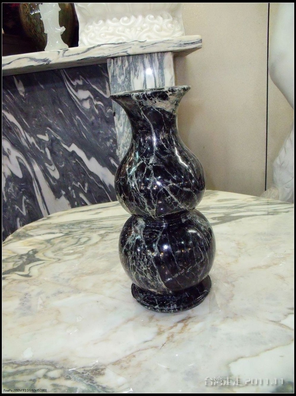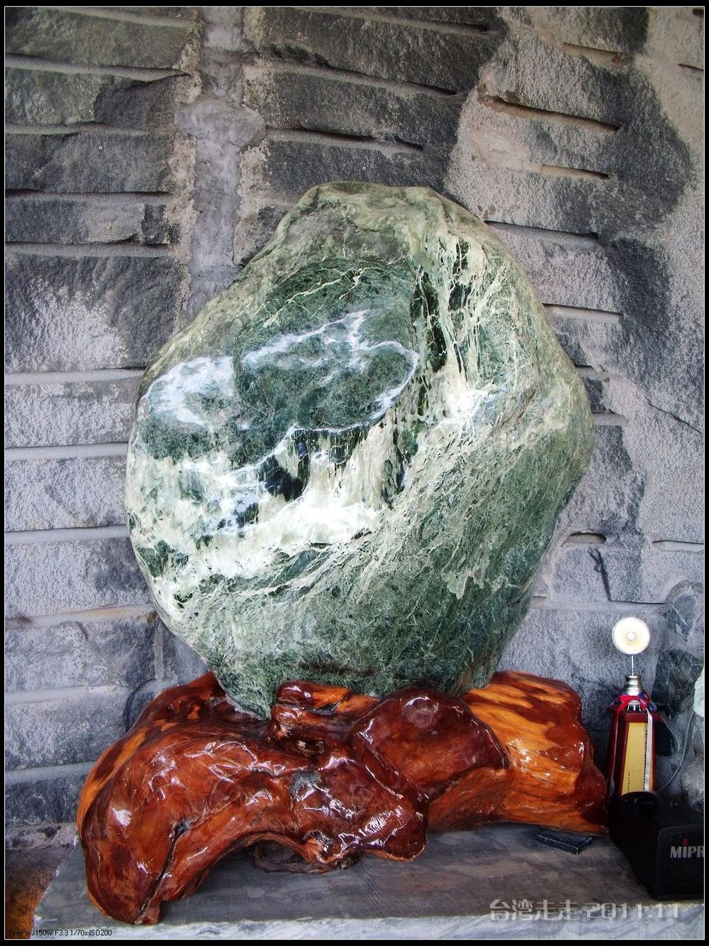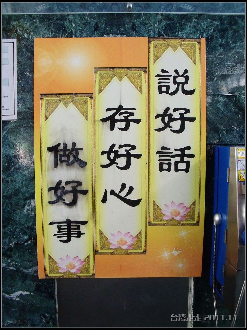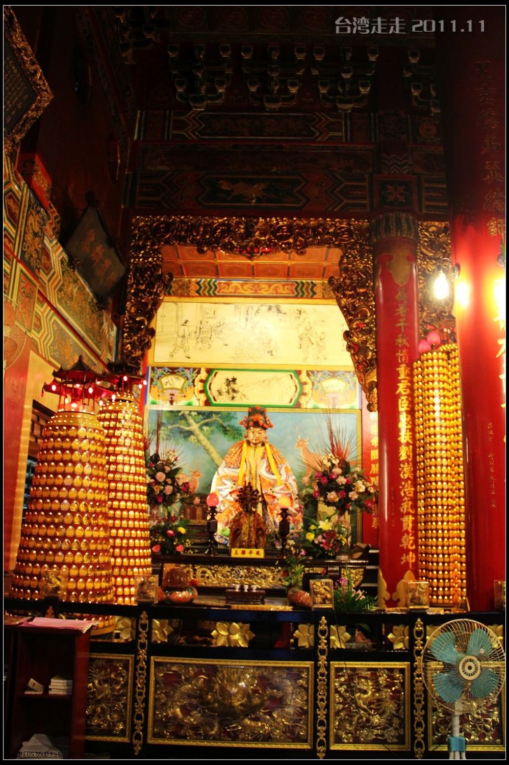 沿湖走进去,阙导带我们来到一座高阶房子前,门口有站得笔直的卫兵,他们是不能动的,可以跟他们照相,但不能碰他们。还有几个黑西服白手套的人在禁示游人喧哗,气氛很紧张严肃的。进门处有一座“福”字屏风,很多人在那里照相。里面是淡水 蓝立柱白色天花板墨绿地毯的回廊,看着到很清爽。