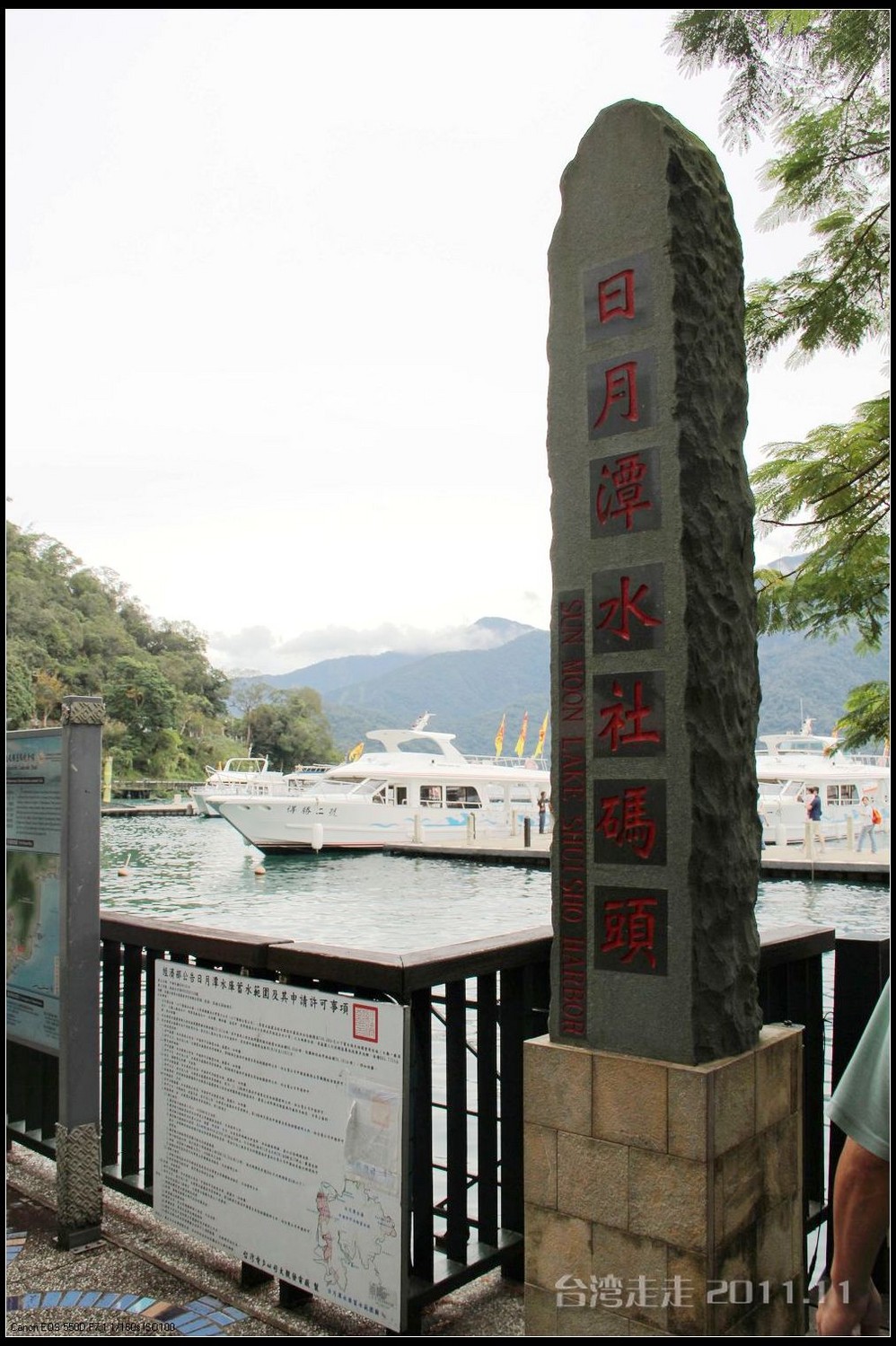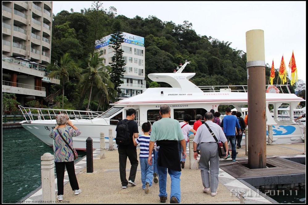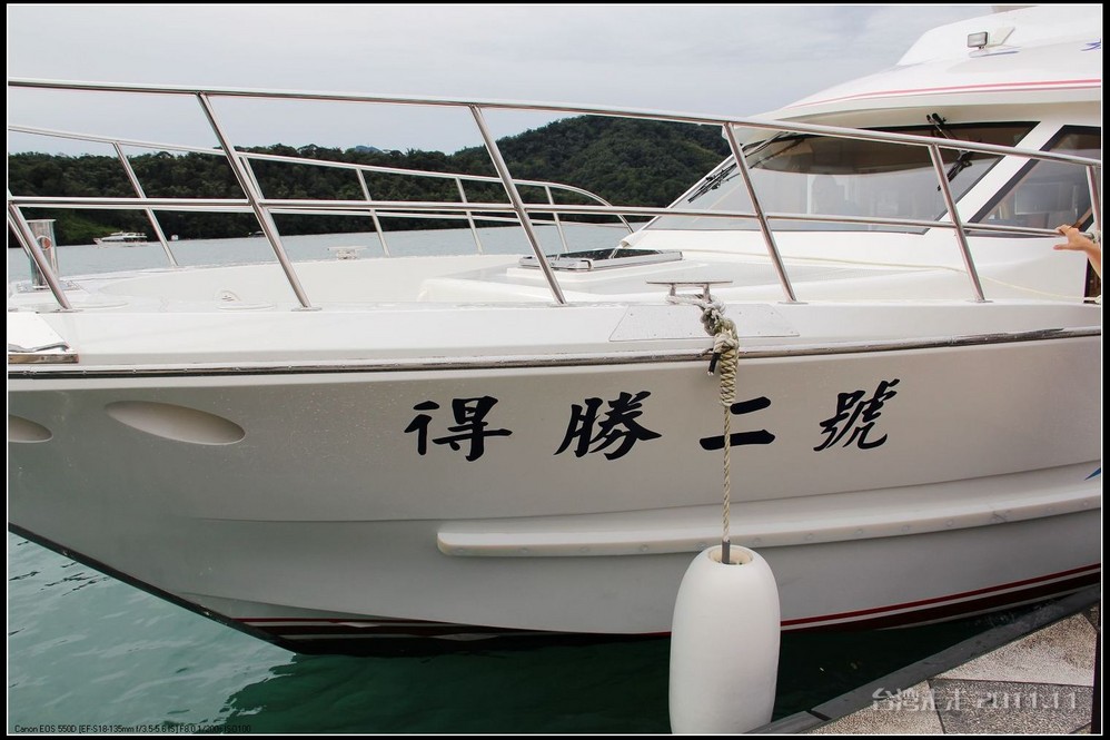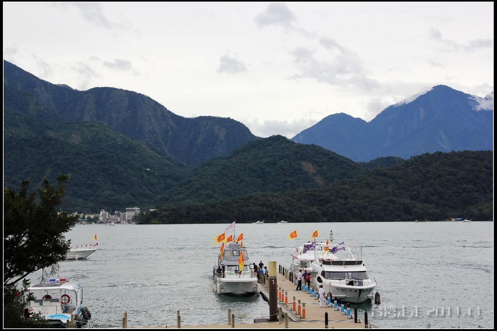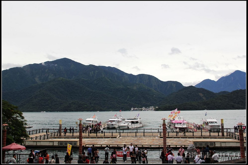 到日月潭后,从停车场还要走一小段路才能到码头。我们是从最大的水社码头,乘游艇“得胜二号”游湖。船老大一路也有不少介绍讲给大家,船上还有电视播放相应的内容。