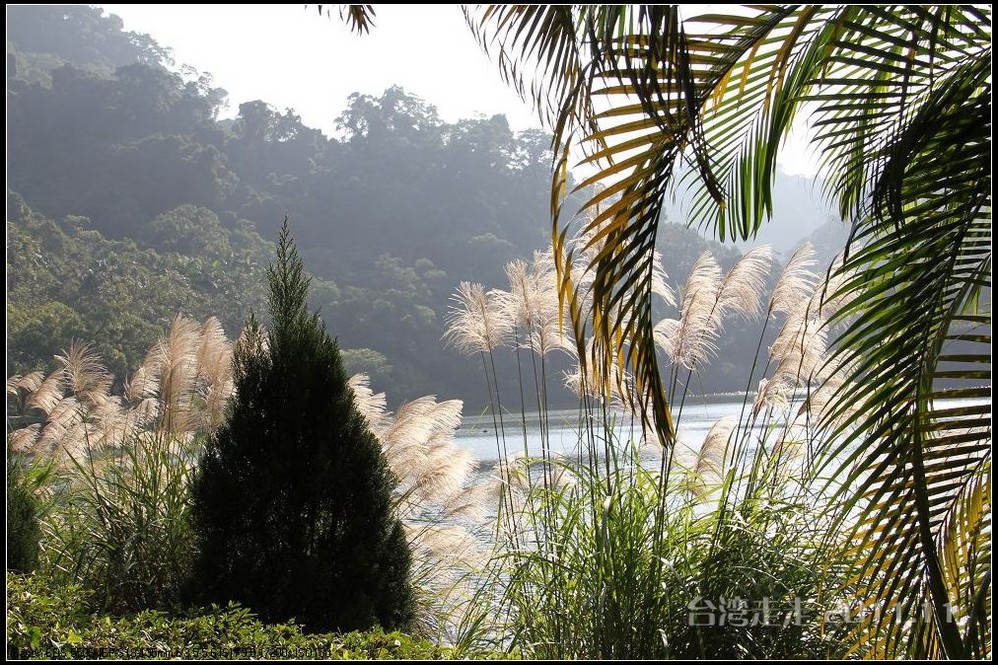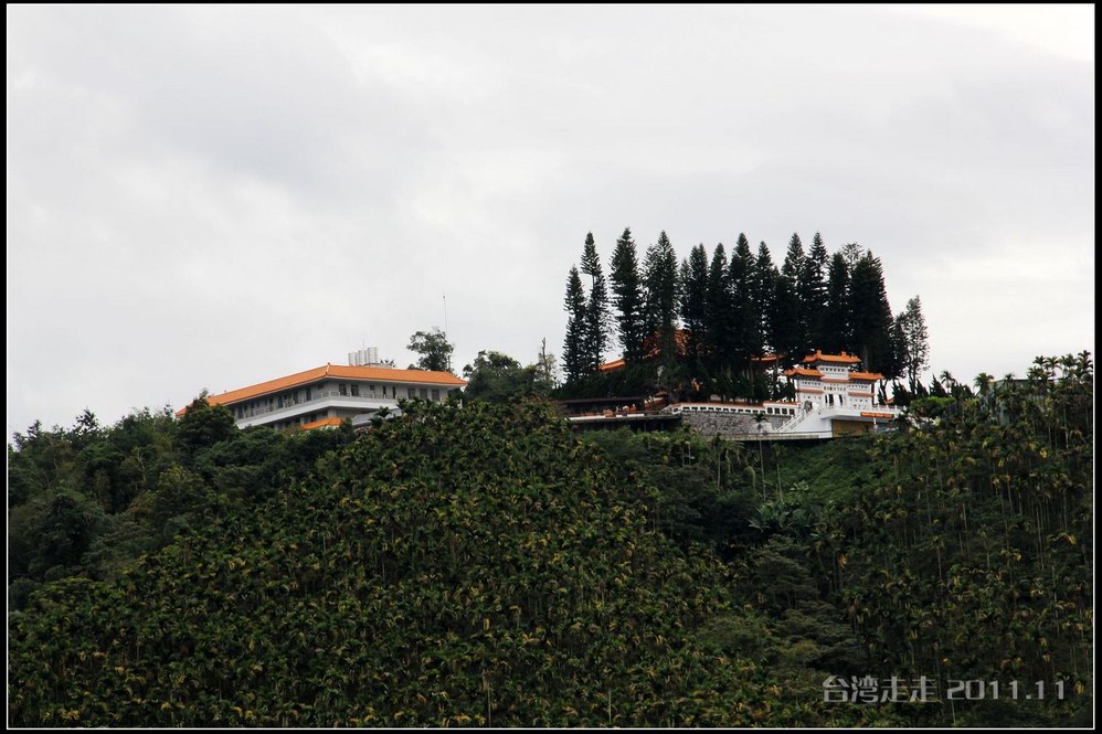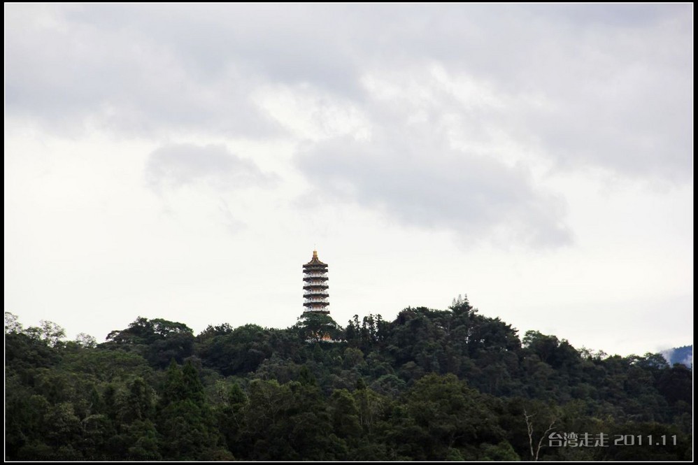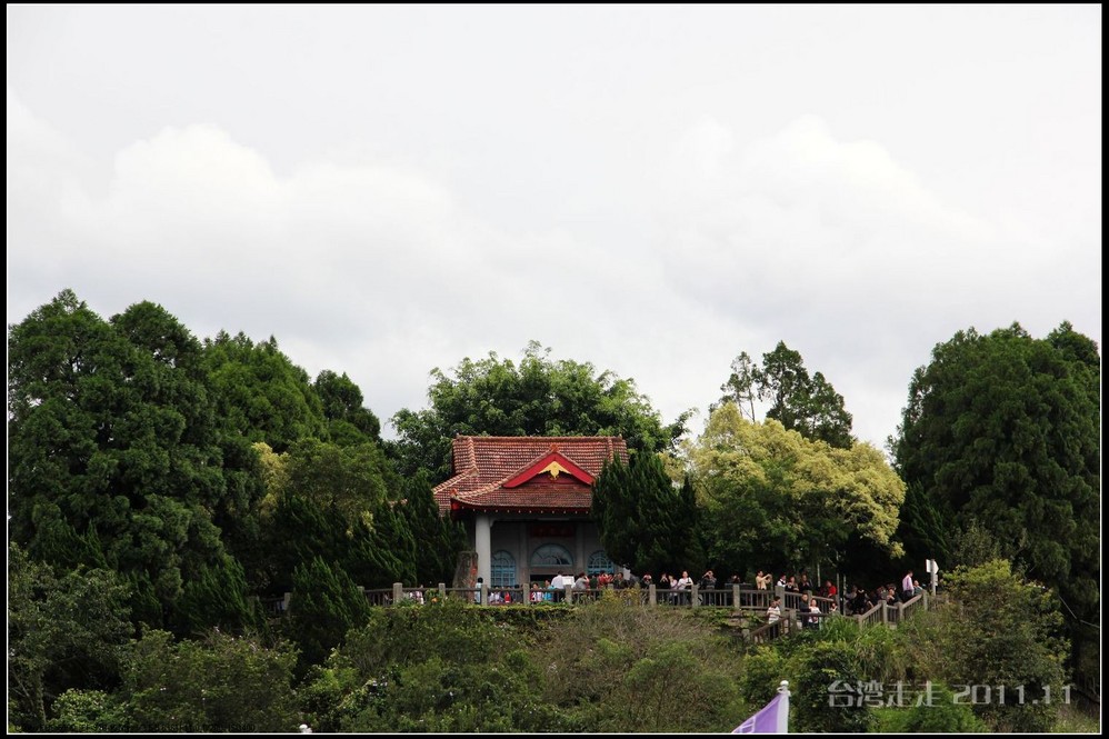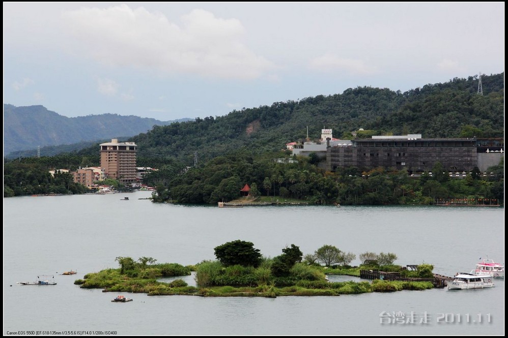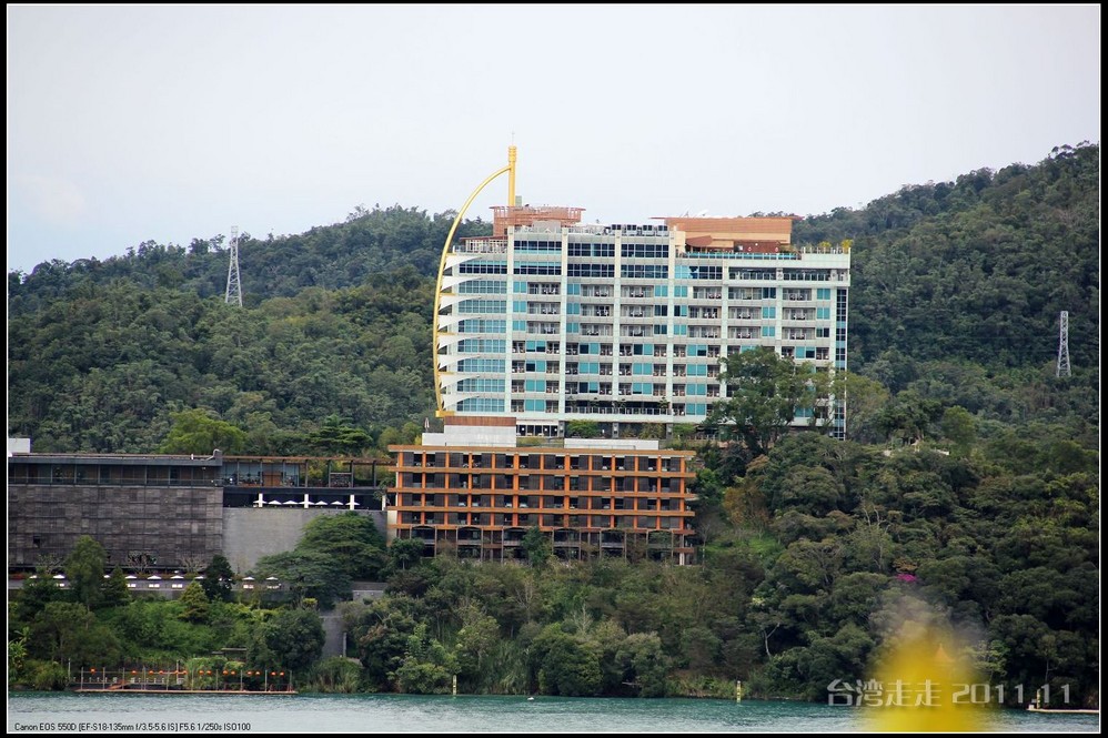 在可以眺望到日月潭美景的小山上,可以更清晰的分辨日潭和月潭。以湖中的拉鲁岛为界,到对岸的一个小红亭子,右手边为日潭,左手边的湖面明显小很多,为月潭。在对岸还有一座建筑有点眼熟噢,形状像个船帆的,大家都知道吧,是模仿迪拜的,哈哈,听说还真是用18K金做的呢。