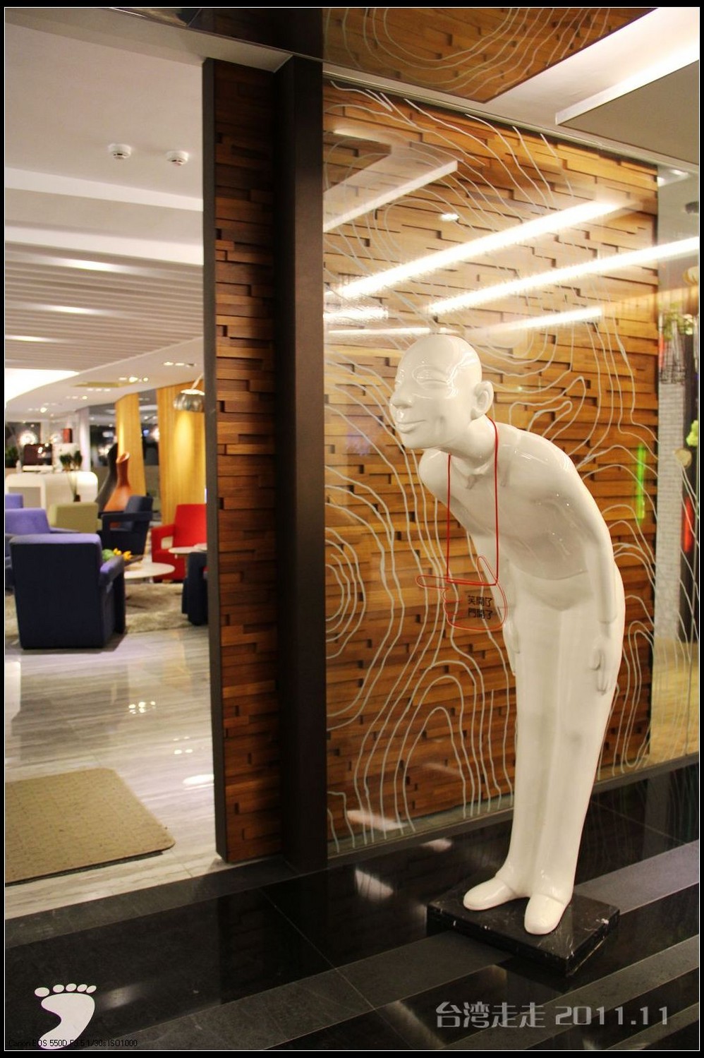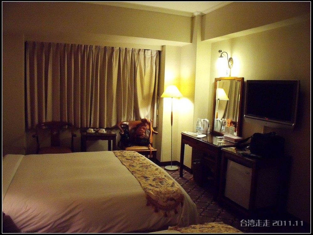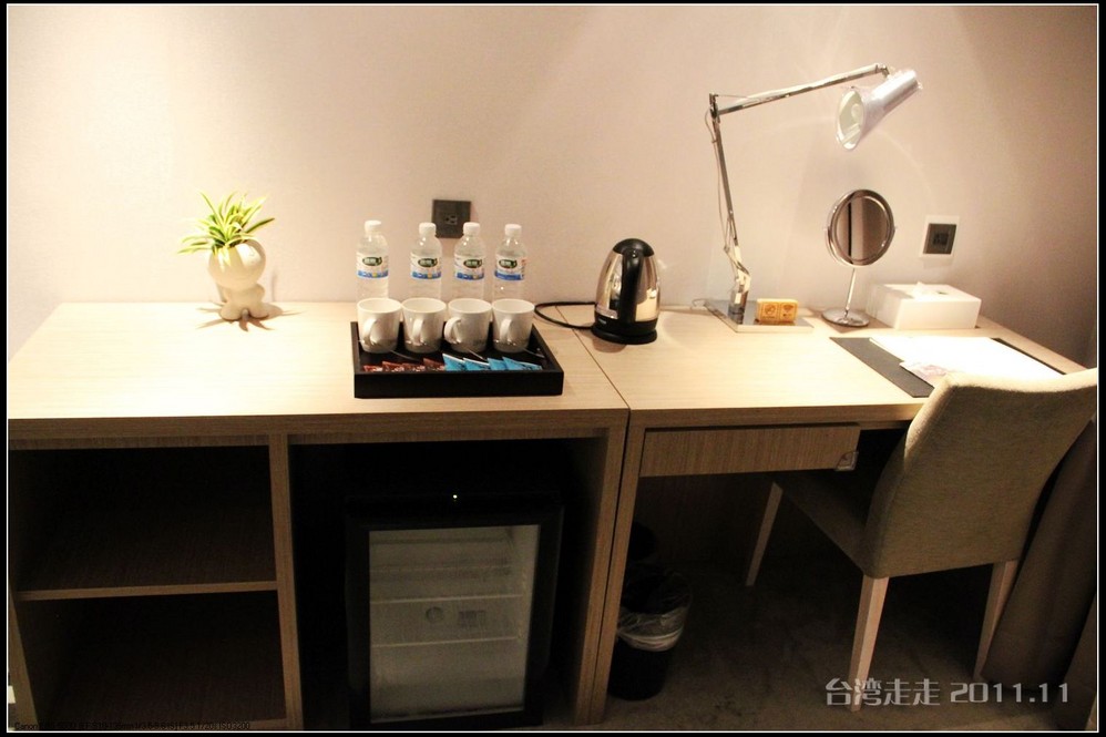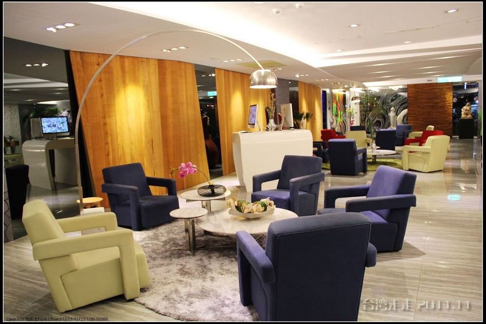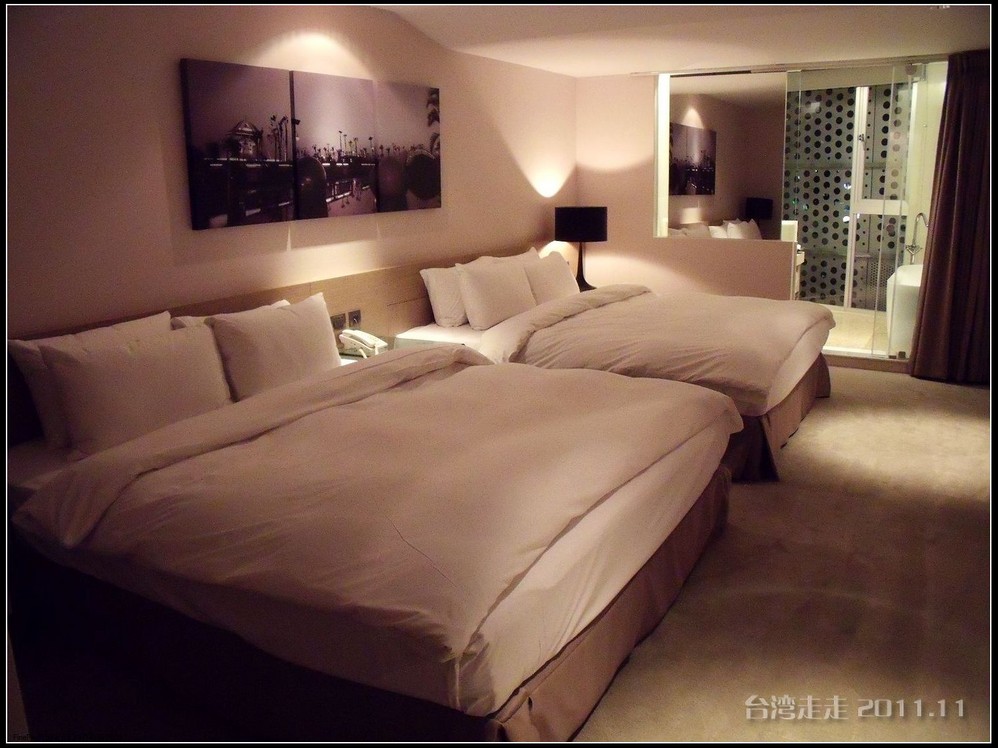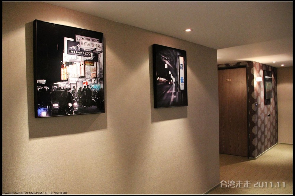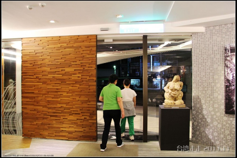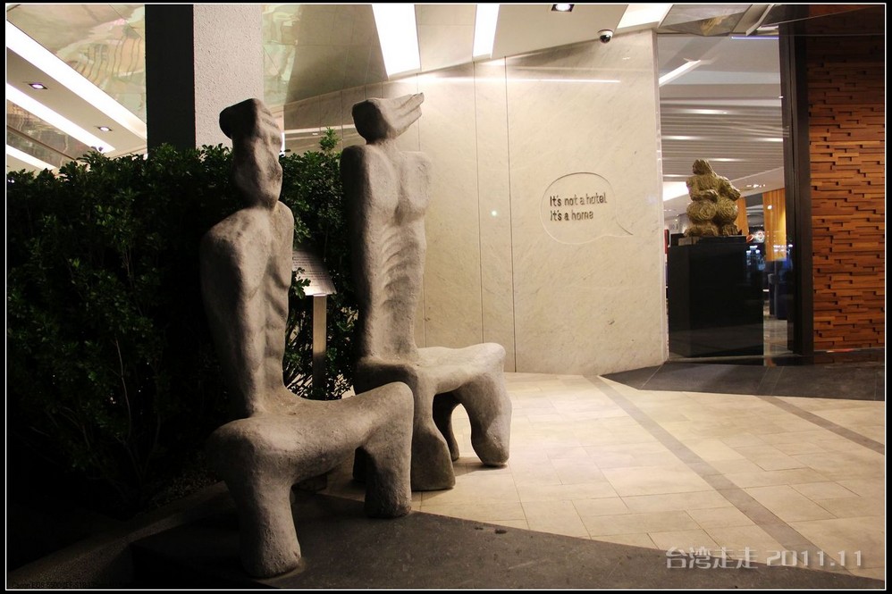 今天晚上住的地方,又让我惊喜一番。叫嘉义商旅 ,进门处就很有趣,有一个雕塑小人,笑咪咪的弯腰站着,脖子上挂着个牌子写着:笑开了,门开了。装潢看上去就很特别,每个电梯间都有不同的装饰。楼里还摆放着各种雕塑,还有嘉义 的老照片,很有艺术氛围。房间里还是好大呀,今天我跟父母一屋住的,两张大床,能睡四个人,配置也是按四人份准备的。还有单独的会客的空间和衣柜、写字台什么的,就像一个大开间的家一样。要是能多住上几天就好了。听说是去年刚开业的。不远处有商场,团队里有人出去逛了,我们一家没出去。明天要早出发,六点半叫早,七点半出发,要去阿里山 了。