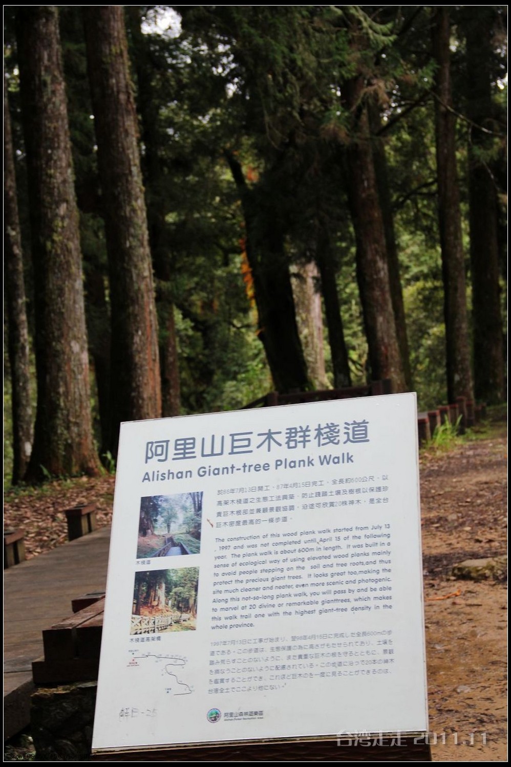 阿里山 巨木群栈道,本来只有阿里山 森林铁路神木 站旁的阿里山 神木 ,在1998年阿里山 神木 倒了以后,林务局整理出阿里山 森林游乐区内的 38株巨木(可能随着有新发现,而数字有所增加)出来,搭建栈道(阿里山 巨木群栈道),成为新景点。连同原来的阿里山 神木 ,并称阿里山 神木 群,树种全部都是红桧。