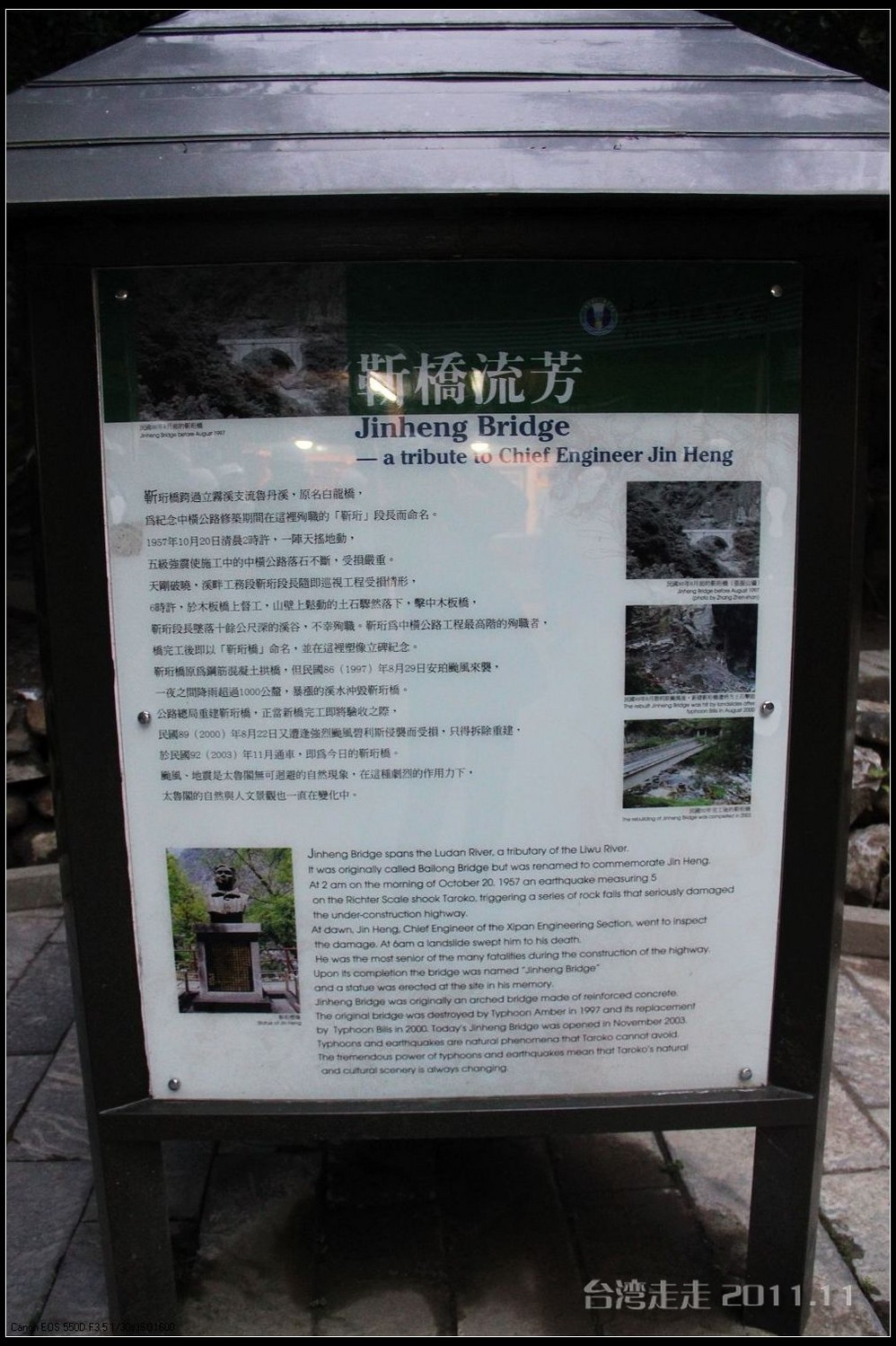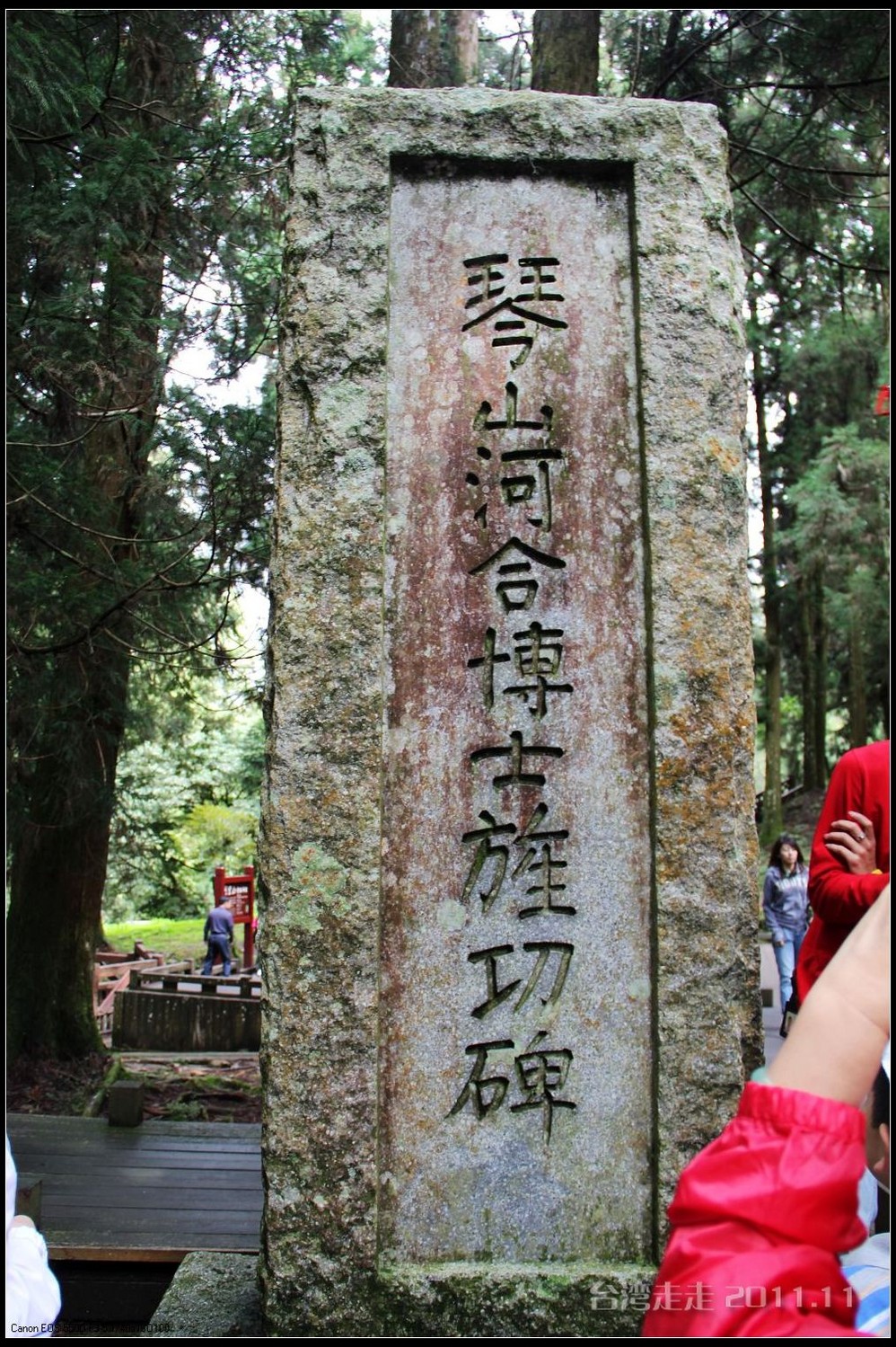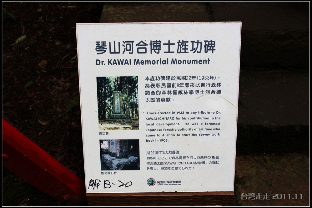 琴山河合(河合铈太郎)博士旌功碑,古人说:“树大且直难逃斧钺之灾”,更何况这等世间罕有的宝树。《马关条约 》后,台湾 成为日本 的殖民地 ,日本人 很快便在阿里山 发现了珍贵的红桧树,认为这是上天赐给他们建筑神社的最佳木材。于是开始在阿里山 修建近乎疯狂的铁路工程。火车上阿里山 ,比火车上八达岭 难度更大,因为海拔高,山道更陡峭。所以,它的技术含量和所铺资金都要大得多。与詹天佑 8字形爬山铁轨不同,日本 工程师琴山河合博士在坡度更陡路段,采取了进两步退一步的Z字形铁轨上山,当地人叫“碰碰”火车。阿里山 上山空间距离不过15公里,而火车绕山跨谷钻隧道到2450米时,却要行驶72公里,加上到其它支线铁路总长达1千公里。有了铁路,日本 人又从美国 订制了大型砍伐捆装设备,可想日本 人下的本钱有多大。阿里山 生长了几千年的巨大宝树,源源不断地被日本 人运出台湾 。从通火车到战败,短短30年左右时间,阿里山 千年红桧树被砍伐30余万棵,整个林场今天所剩的5、6棵,还是因为长得难看或长得神奇,才得以保全。日本 战败后,当局本来是要炸掉这座碑的,但最终没炸,保留了下来为的是两个字。细看那碑:碑文是琴山河合亲笔,大而醒目的魏碑体字,留下两个明显的错别字:一个是博士的博少一点;一个是功勋的功力没出头。据说他的自传是这样写的:他为自己的得意工程而毁了阿里山 千年宝树而内疚自责,又不敢违拗上命,只有用这没有功勋不为博士的自责告知世人,并向阿里山 谢罪。