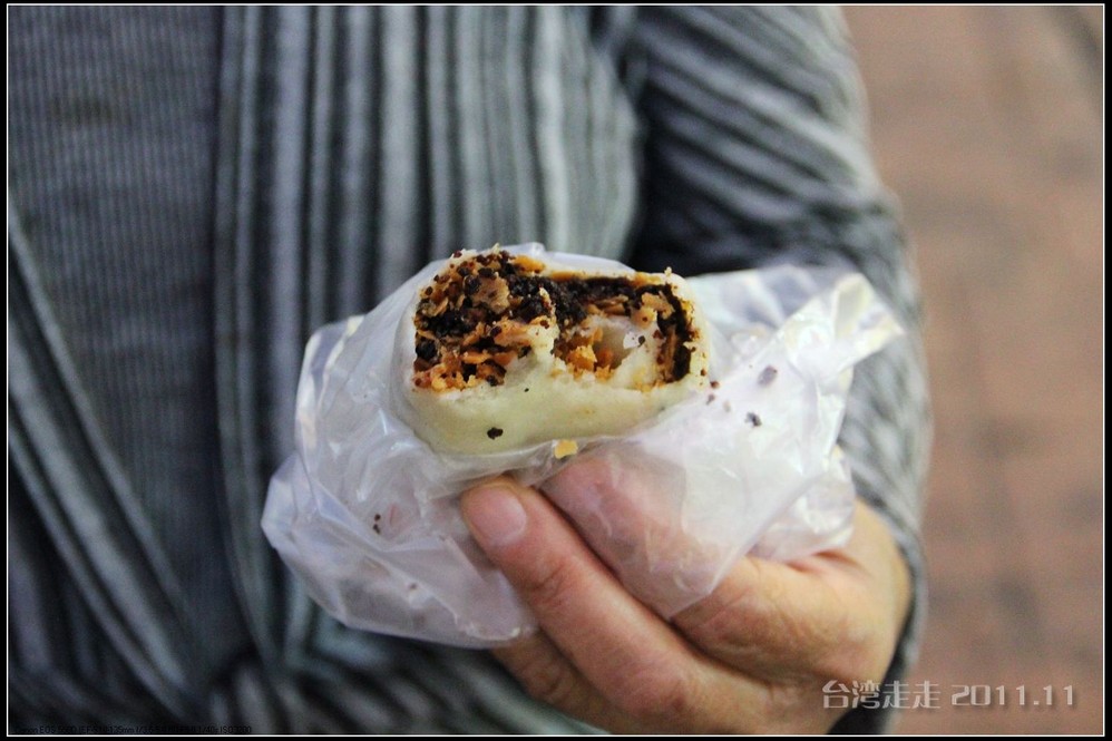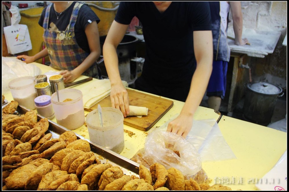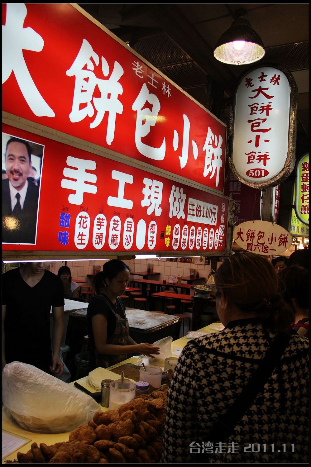 “大饼包小饼”, 制作的油炸馅饼,是小饼,有很多口味,甜味咸味的都有。备妥面饼皮,是大饼;把小饼置放于大饼里,拍松,用大饼卷起来,就可以吃了。相传是:士林大饼包小饼的创始人陈庆昌原来在士林市场内租了一间店面卖家乡的大陆饼─酥饼,不久他做锅饼的朋友前来投靠,两人便一起卖锅饼和酥饼。几年后这位老友病了,陈先生感念老友同甘共苦,而将锅饼与酥饼合而为一,成为今日的大饼(锅饼)包小饼(酥饼)。我们买了个豆沙馅的,NT35元。