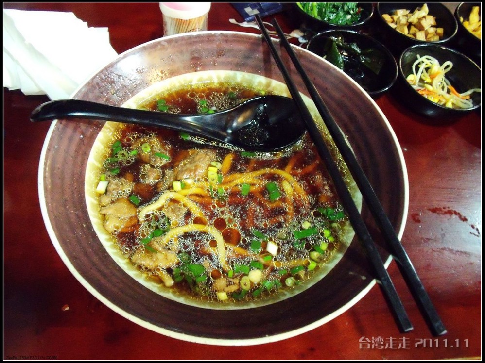 由于刚才已经大饱口福,晚餐阙导就安排大家吃牛肉面了。他说在这家店里,什么都可以加,比如 上的小菜不够可以加、面不够可以加、汤少了可以加,只有牛肉不可以加。哈哈,那是自然了,要是连这个也可以加的话,老板不是赔了。不过我们已经都吃得差不多了,也就能吃一碗牛肉面了,白给我加我也吃不了。碗挺大,其实面并不多。味道一般。我跟老爸先把刚才买的蚵仔煎分吃了,这个到是挺好吃的。