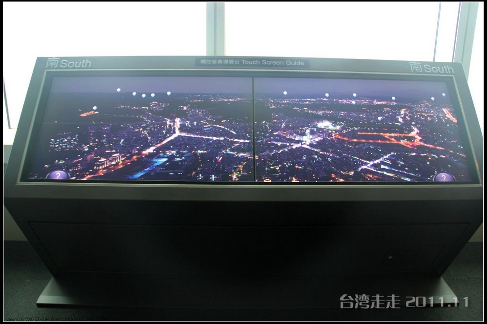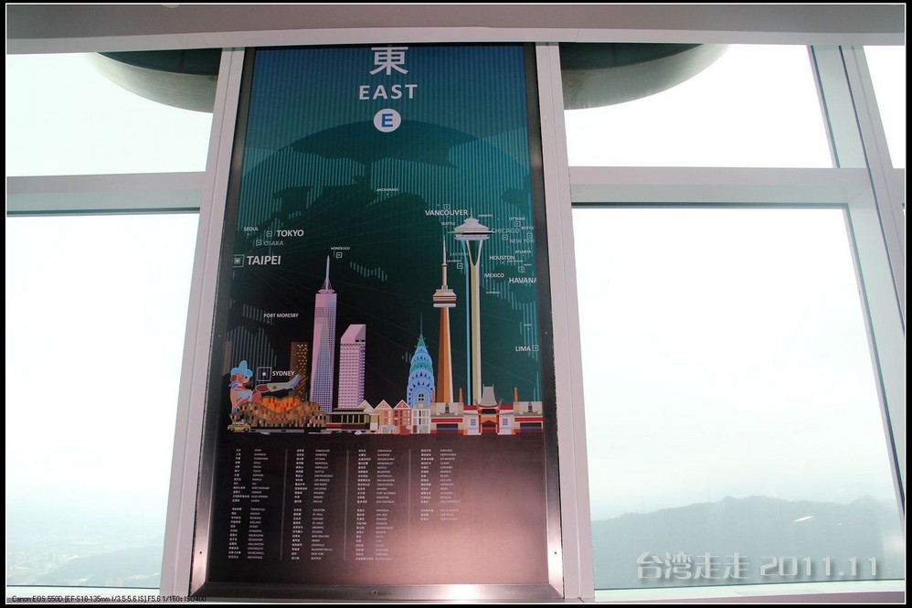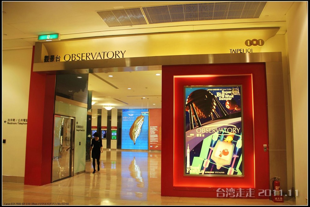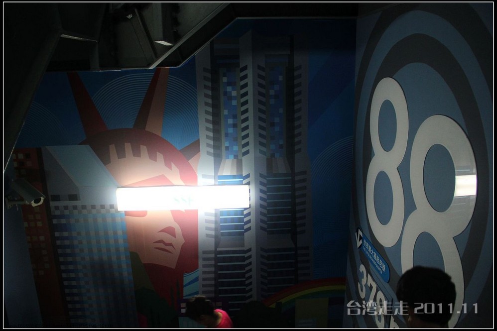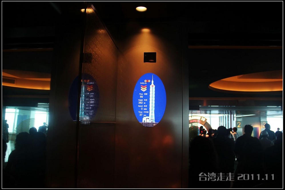 电梯那么快的速度升高那么多米,居然都没有感觉的。电梯的天花板上有星空一样的图案,很好看。37秒,转眼间就已经来到了89层高的观景台,一出电梯就有101的代表小人“红金宝”欢迎大家的光临。拿着门票到服务台领一个导缆器,像手机一样的东西,当你参观到几号窗前就按几号按钮,就会听到介绍了,很方便呀。环绕一周,听着介绍,鸟瞰台北 市貌。