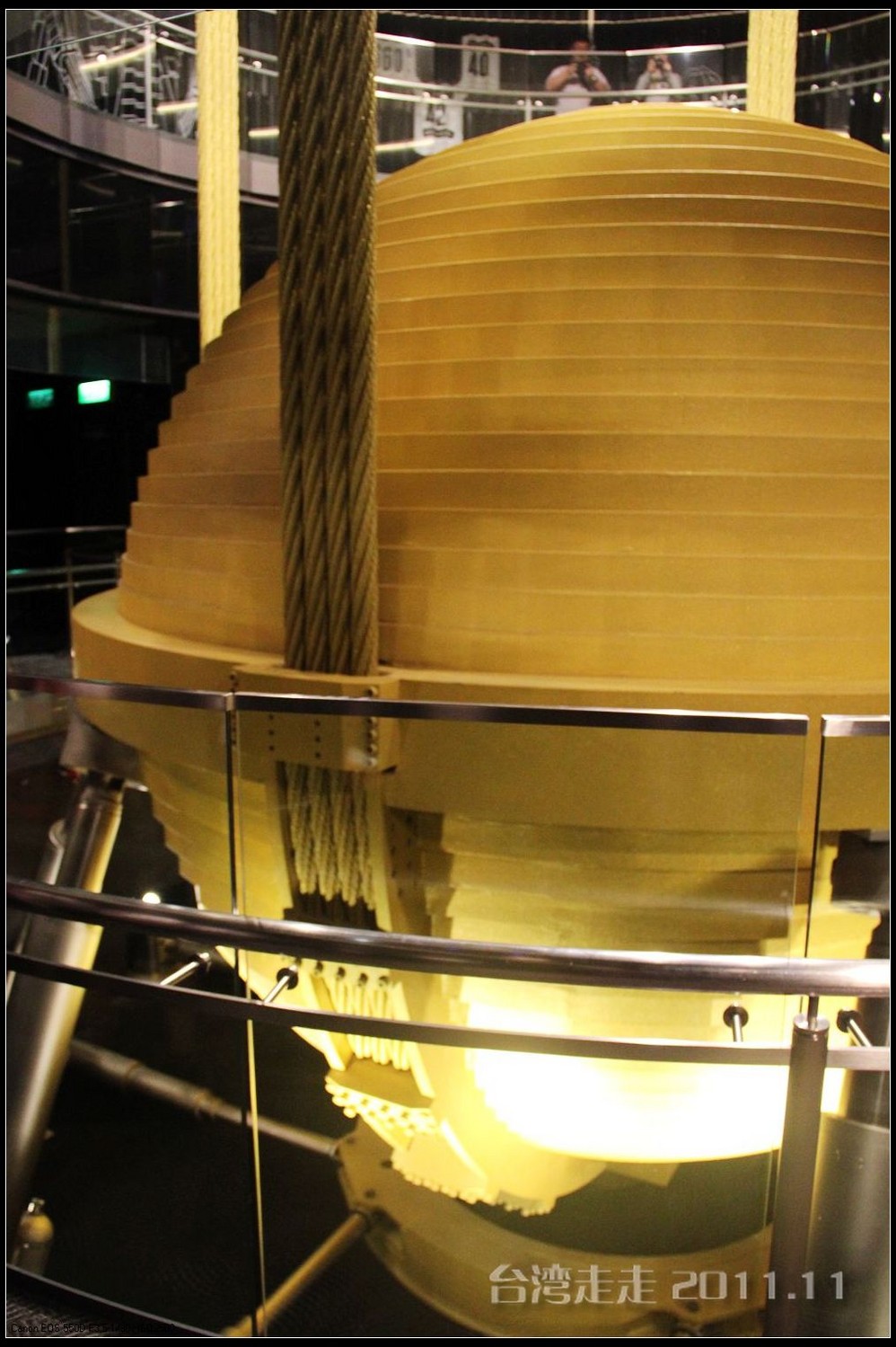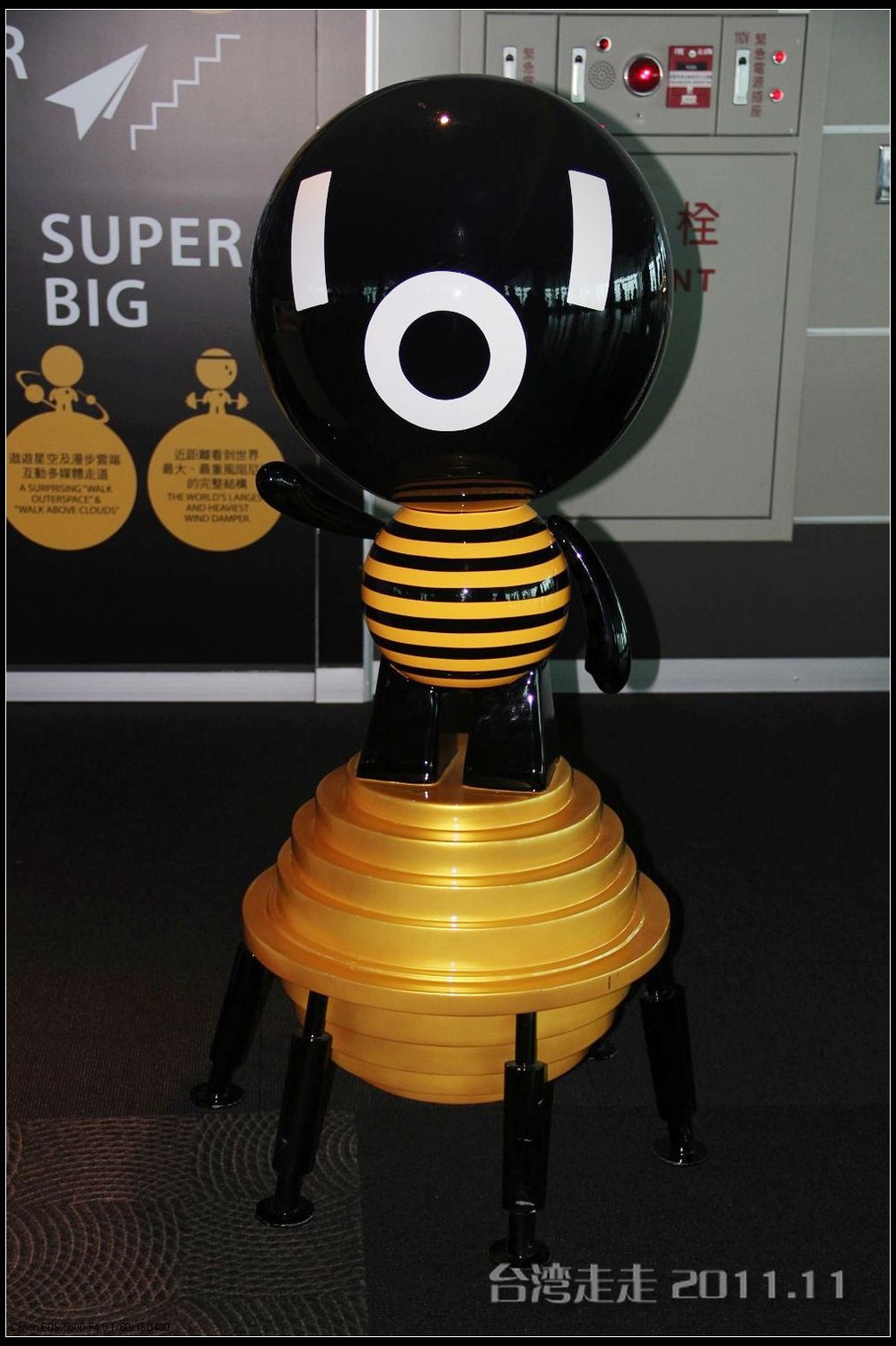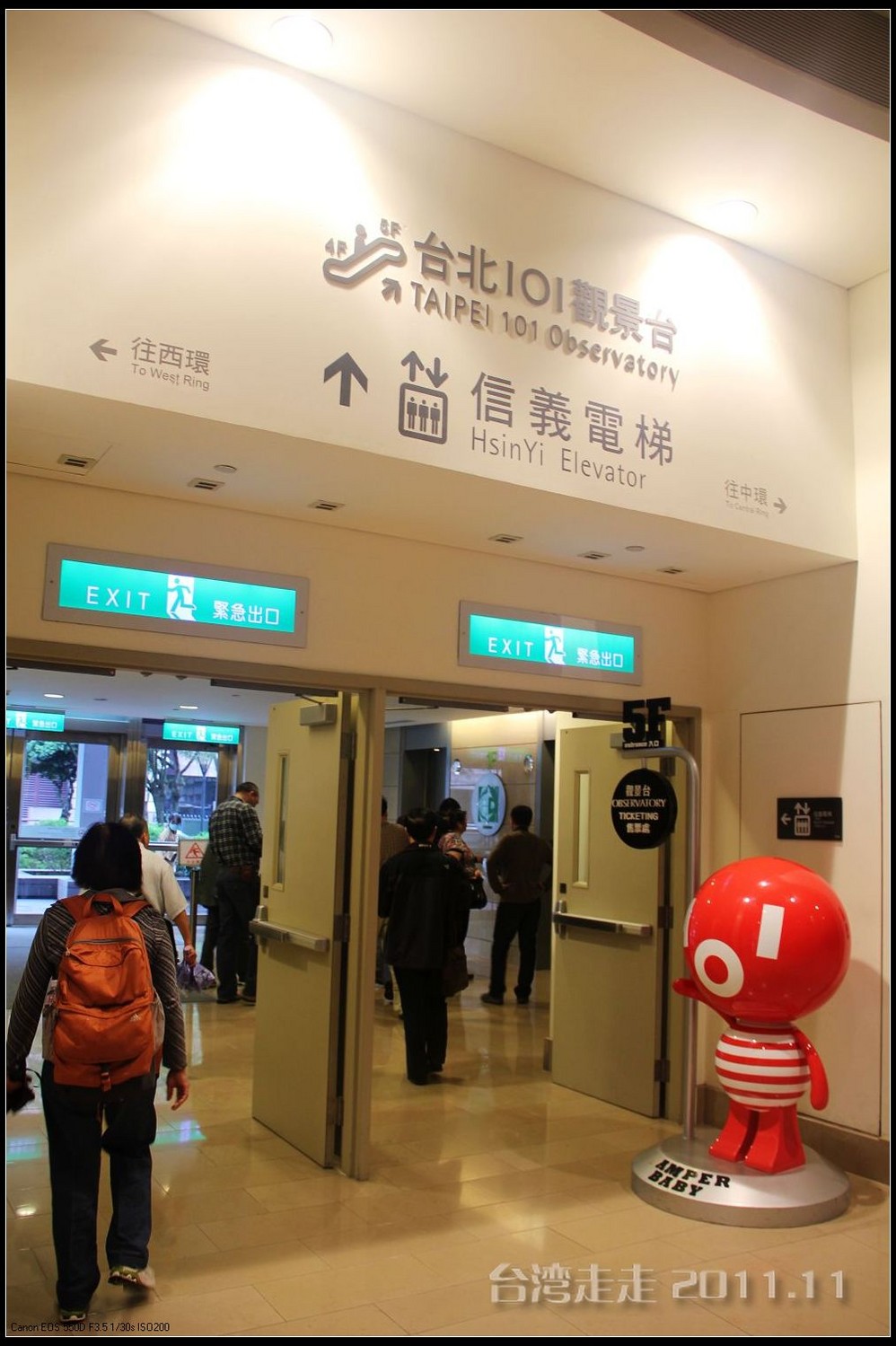 电梯那么快的速度升高那么多米,居然都没有感觉的。电梯的天花板上有星空一样的图案,很好看。37秒,转眼间就已经来到了89层高的观景台,一出电梯就有101的代表小人“红金宝”欢迎大家的光临。拿着门票到服务台领一个导缆器,像手机一样的东西,当你参观到几号窗前就按几号按钮,就会听到介绍了,很方便呀。环绕一周,听着介绍,鸟瞰台北 市貌。