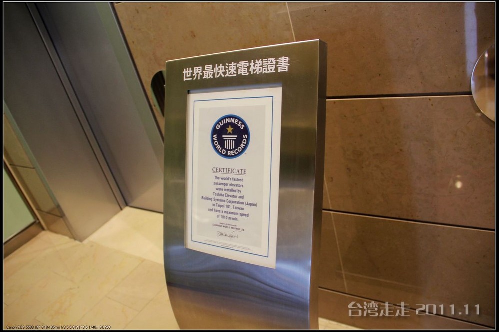 “Taipei 101”还拥有世界最高速度的电梯 :从5楼直达89楼的室内观景台只需37秒,电梯攀升的速度为每分钟1010米,是世界最快的电梯,其长度也是世界第一。还有世界第一座防震阻尼器 外露于整体设计的大楼,重达660吨,在85、86、与88楼用餐可以看到这个带有装饰且外型像大圆球的阻尼器,其直径5.5米也是世界第一。