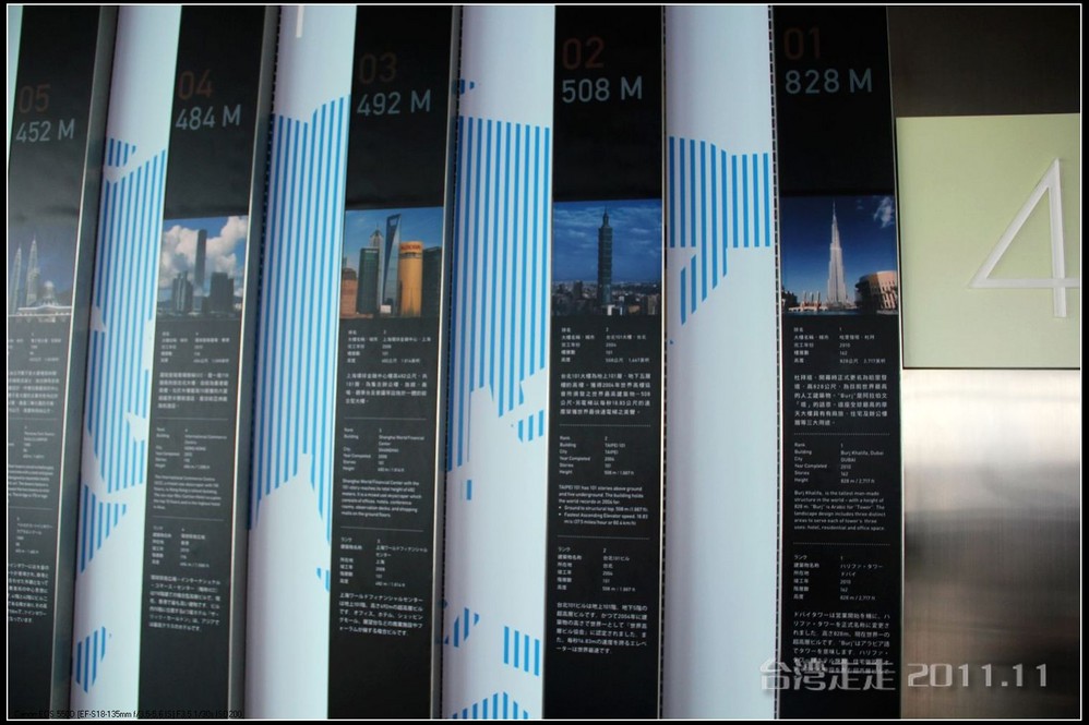 台北 101(Taipei 101),又称台北 101大楼,位于台北市信义区 ,在规划阶段初期原名台北 国际金融中心 (Taipei Financial Center),由建筑师李祖原 设计。1999年7月开工,2003年10月竣工,建筑高度:508米,因为不断有更高的大楼出现,所以它的具体排名也会发生变化,但肯定在目前“世界最高大楼”的排行中名列前茅。“Taipei 101”这个名称里还有个隐义:Technology、Art、Innovation、People、Environment、Identity,即技术、艺术、创新、人民、环境、个性。