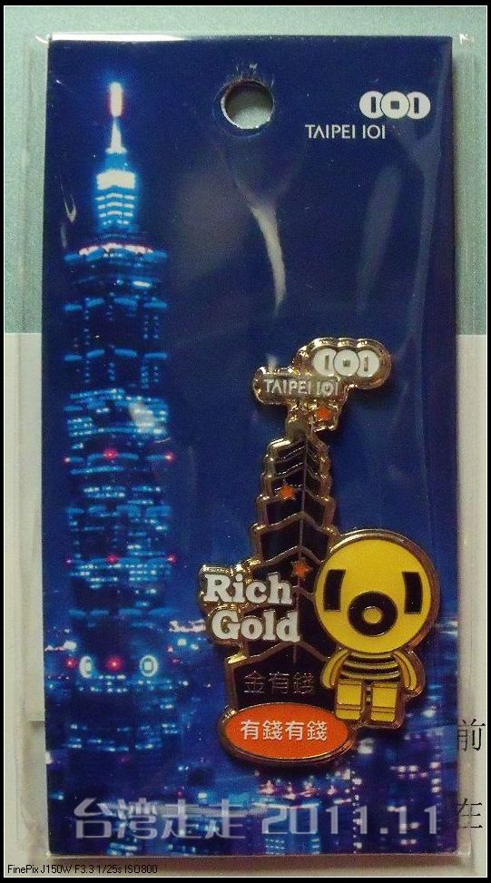 临走前,我还是没舍得放弃买纪念品的机会,虽然老爸不太乐意让我花钱,我还是买了一张明信片和一个冰箱帖,这是我最低的要求了。明信片NT30元,比故宫的白菜还贵NT10块钱呢。我记得刚才参观时发现有个地方可以盖章的,于是我拿着我买的明信片去找到了那个地方,盖下了代表着101大楼的那几枚章。其实最好的是应该从那寄回北京 来,可又怕半路寄丢了,还是自己背回来好了。至于小家伙们除了“红金宝”,还有“金有钱”、“黑巧客”、“银丝卷”和一个绿色的小可爱。我最终选择了“金有钱”带回家,希望他助我财源滚滚吧,哈哈。“金有钱”是真要钱呀,NT165元,RMB35块多呢,不便宜。
