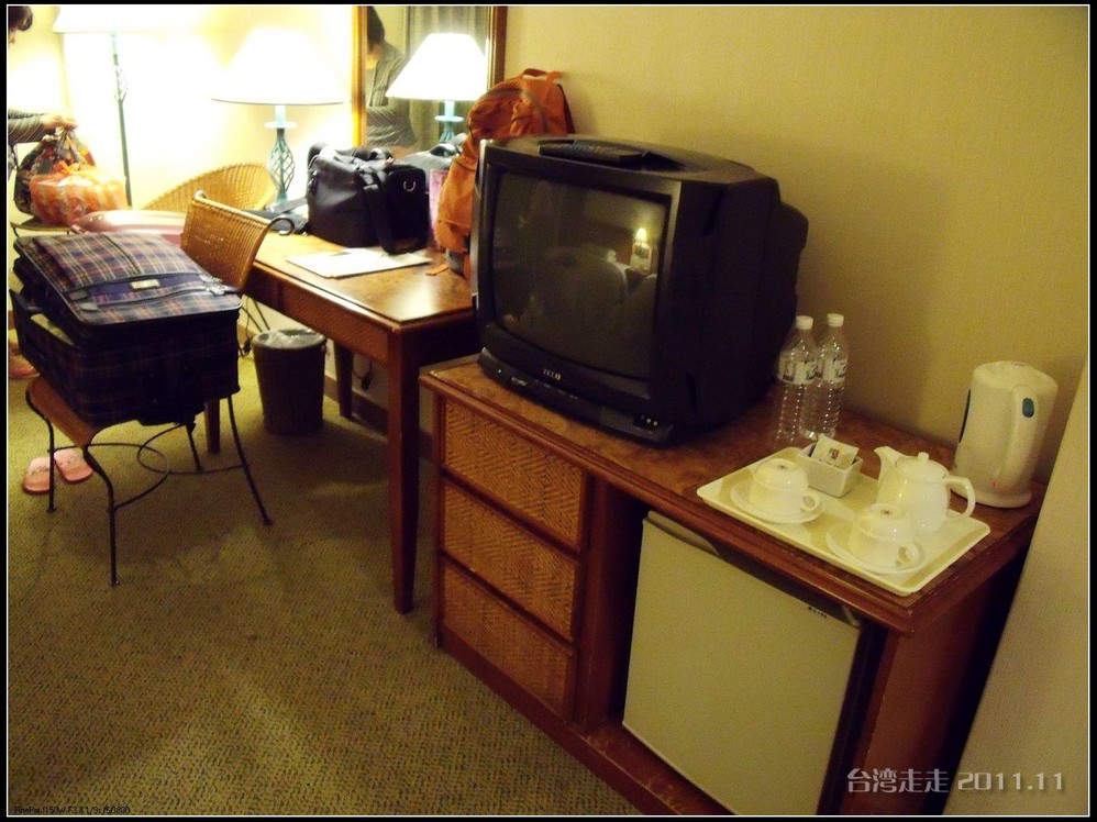 果然,我先到我父母住的房间看就已经很好了,房间很大,这间算我们团里比较小的了,还有35平呢,而且卫生间也很大,有浴缸,还有沐浴、桑拿,房间里有香蕉、桔子,还有零食小吃,咖啡包和茶包更不用说了,洗漱用具、拖鞋什么的全都有。房间里还有背景音乐,所有的控制都在一个大遥控板上。为了研究怎么关了所有的灯和音乐,好睡觉,还研究了半天遥控器呢,哈哈。