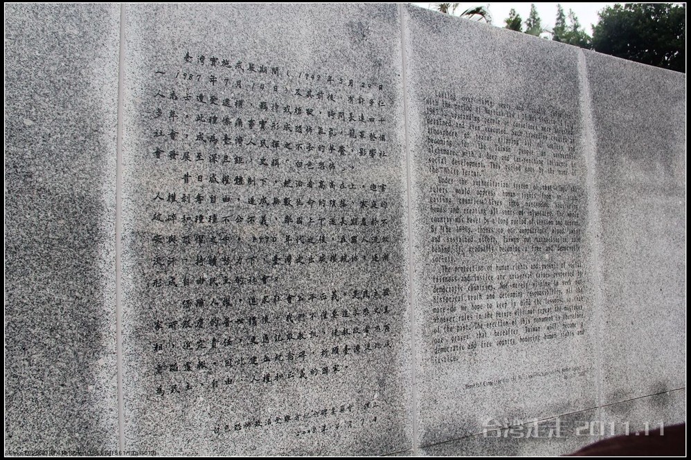 在“总统府”附近,有一座“白色恐怖政治受难者纪念碑”,碑文有这样的描述:台湾 实施戒严期间(1949年5月20日—1987年7月14日)及其前后,有许多仁人志士遭受逮捕、羁押或枪杀,时间长达四十多年。此种惨痛事实形成恐怖气氛,笼罩整个社会,成为台湾 人民挥之不去的梦魇,影响社会发展至深且巨,史称“白色恐怖”。