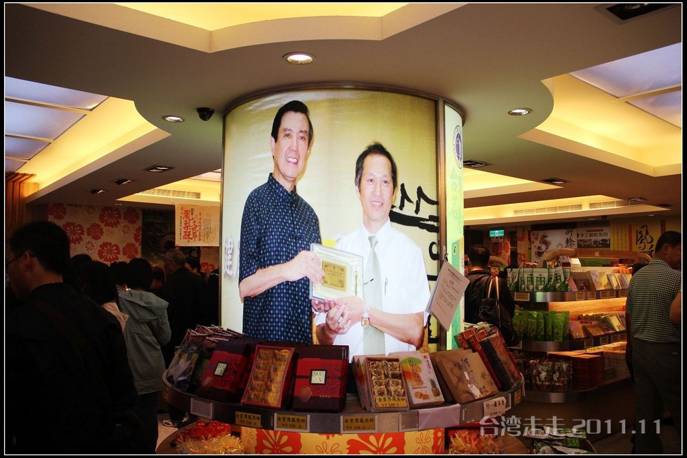 这也是团队游的一个购物店,人真多。一进店,就能看到马英九的大照片,像是在给店家颁奖时照的。一个团的人发同一个号的一张纸,结帐时要出示,谁都明白,给导游提成用的,我们团当时是154号。店里有人招呼大家围到一个小桌前,先是让大家免费品尝,真的是随便吃、可劲吃,吃完马上就有新的拿出来。真的非常好吃,尤其是那个冰心绿豆皇。台湾 这些食品还不能买太多,因为他们都不加防腐剂,所以保质期很短。