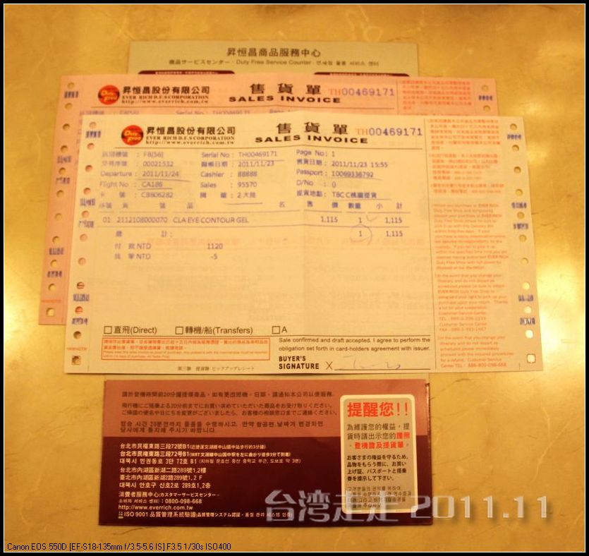 我们还要做两件事,一件就是找到市区免税区的机场取货处,地方很小,问了服务人员才找到。顺利取到了我买的化妆品和烟。第二件就是要把我们手里新台币换回人民币,也是好小的一个柜台,差点都走过了。把3000元新台币递进柜台,她跟我要了RMB10元后,给了我们RMB600元,扣除手续费NT100元,还找给我一些台币的零钱。当时的汇率是4.888了,换回的人民币要比8天前缩水了。