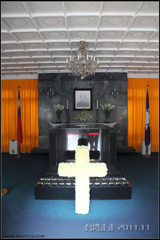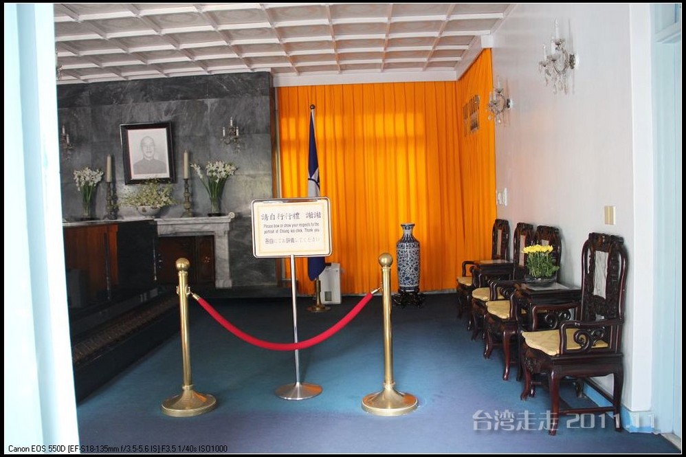 正厅里,墙上挂着老蒋的遗像,壁炉上供着鲜花与烛台,两旁是国民党旗和中华民国国旗,前面是放置在黑色花岗岩上的铜棺,上面覆有青天白日。棺前是一个由黄色雏菊扎成的十字架,标明了老蒋的基督徒身份。这里原是老蒋的会客厅,并不宽敞,放下灵柩,显得很狭窄。 走了一圈,参观一下,就离开了这里,要不都不能说话。