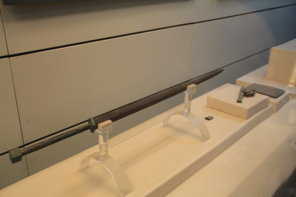 这把青铜剑也很来头,据说是镇馆之宝呢,因为埋在土里的时候是软的,出土后才伸直的