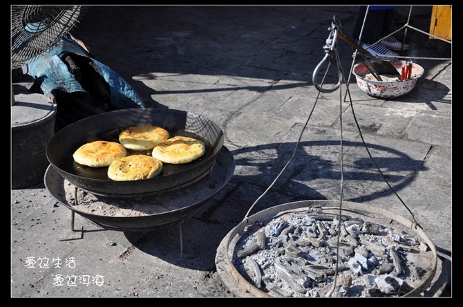 喜洲粑粑,有咸有甜,每个四元。用这样的炭炉做的才是正宗的~