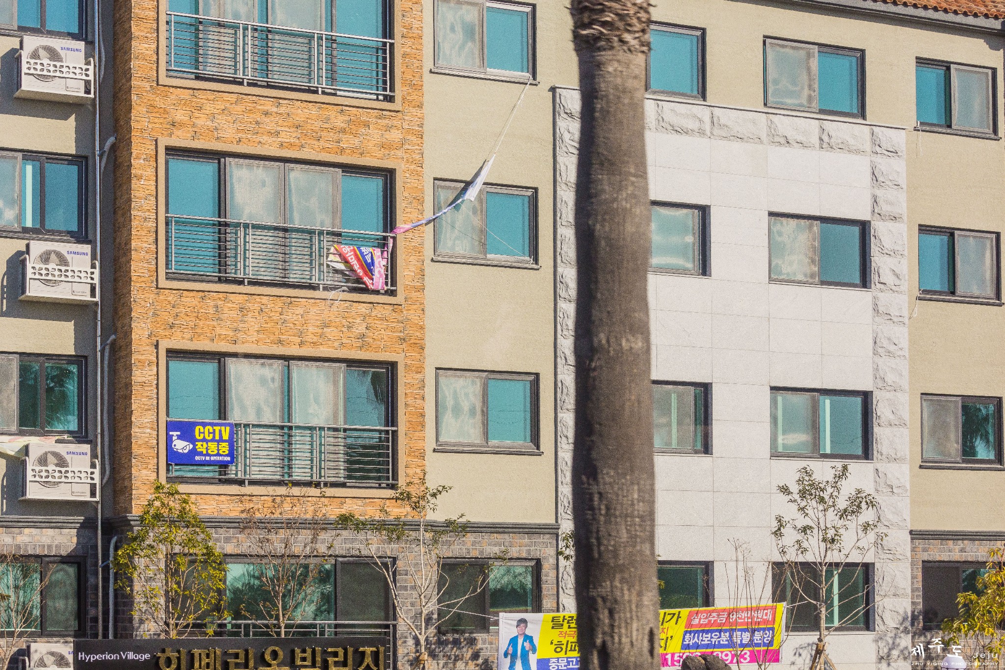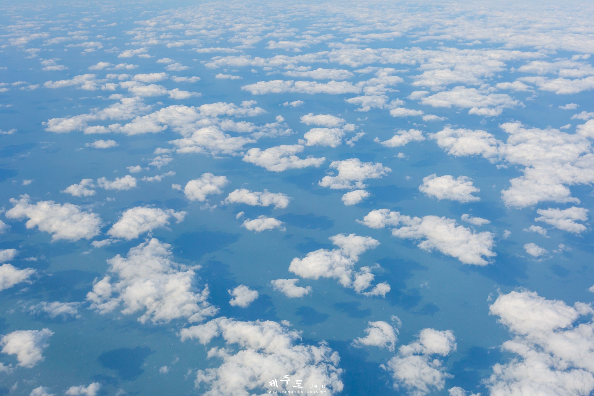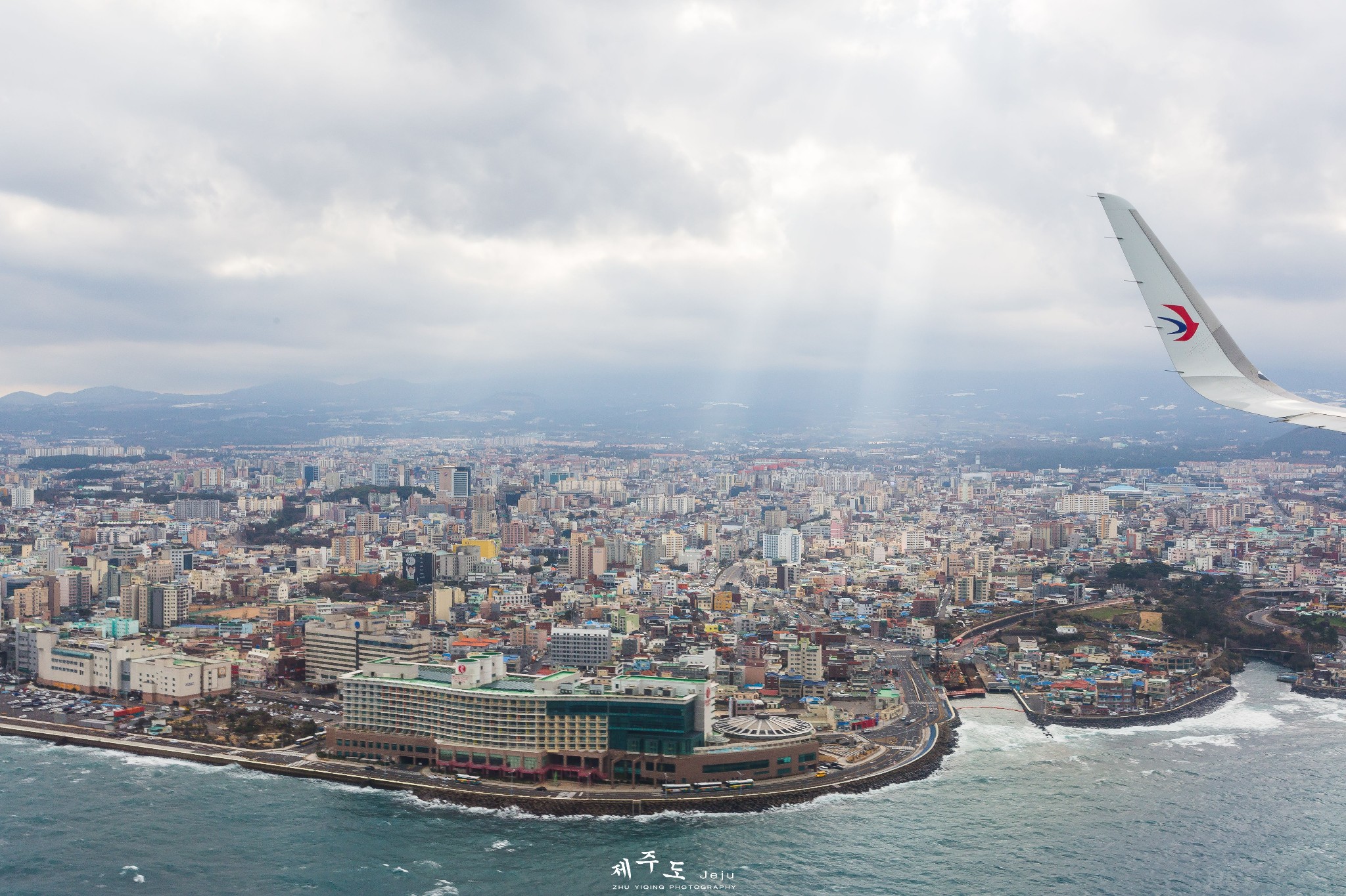 从蓝天白云的云层中,一层层拨开云雾,飞机终于要降落在这个游离于韩国本土之外的济州岛。似乎云下的天气不怎么好,密密麻麻的房子在阴沉的天气下显得有点沉重。