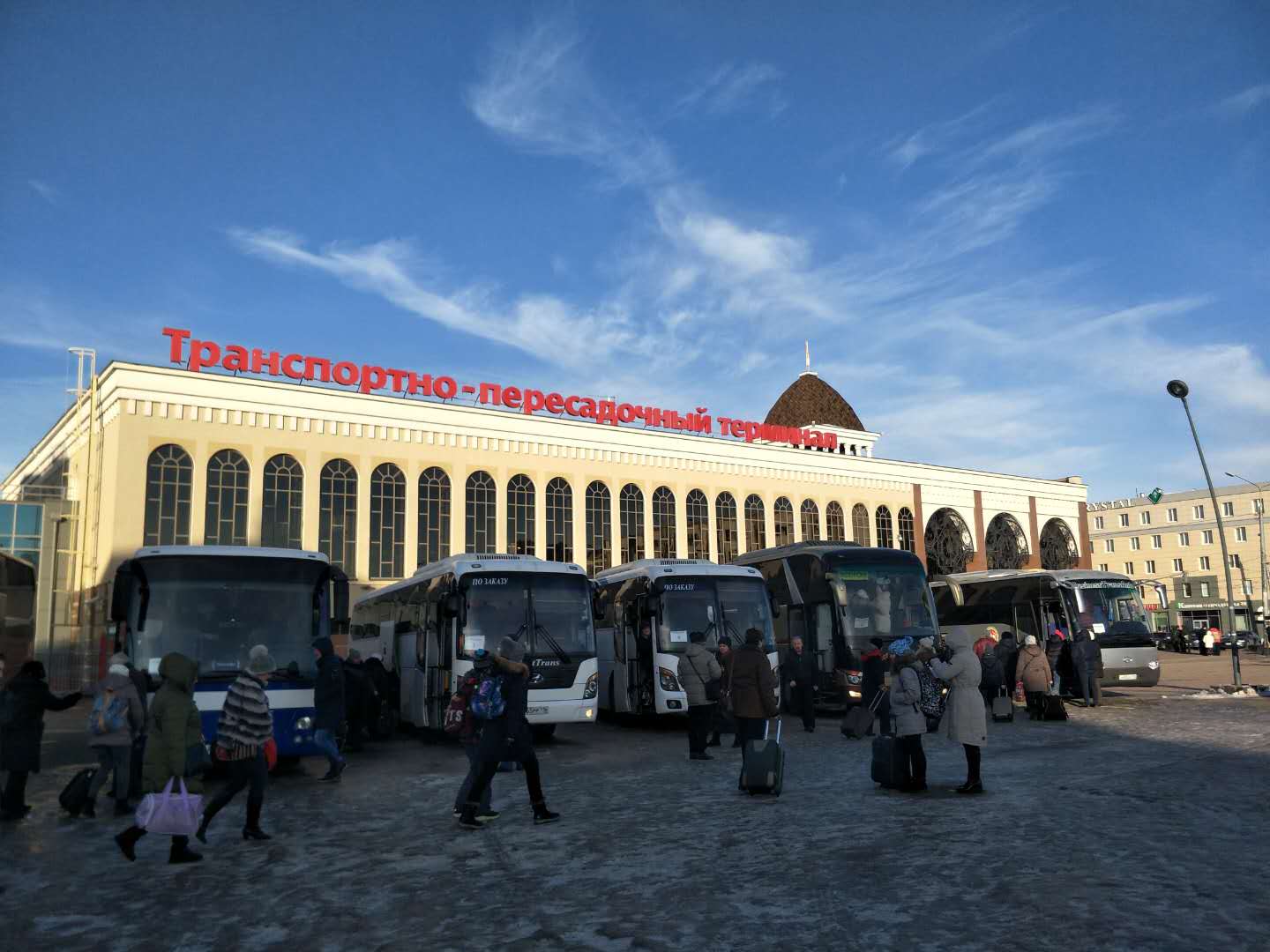 第一天12点到达喀山,到喀山的时候还是大中午,阳光超好,在彼得堡呆了好几个月没有见到过阳光了,心情不由自主的好了起来。喀山零下10度左右,还是蛮冷的,属于温带大陆性气候,和彼得堡的冷还是不太一样的。下图是喀山火车站,和火车站附近的建筑物,安检不是很严,人很好,很热情,喀山的人普遍说话都是带口音的。我们很幸运,每次打车都能遇到帅小哥。