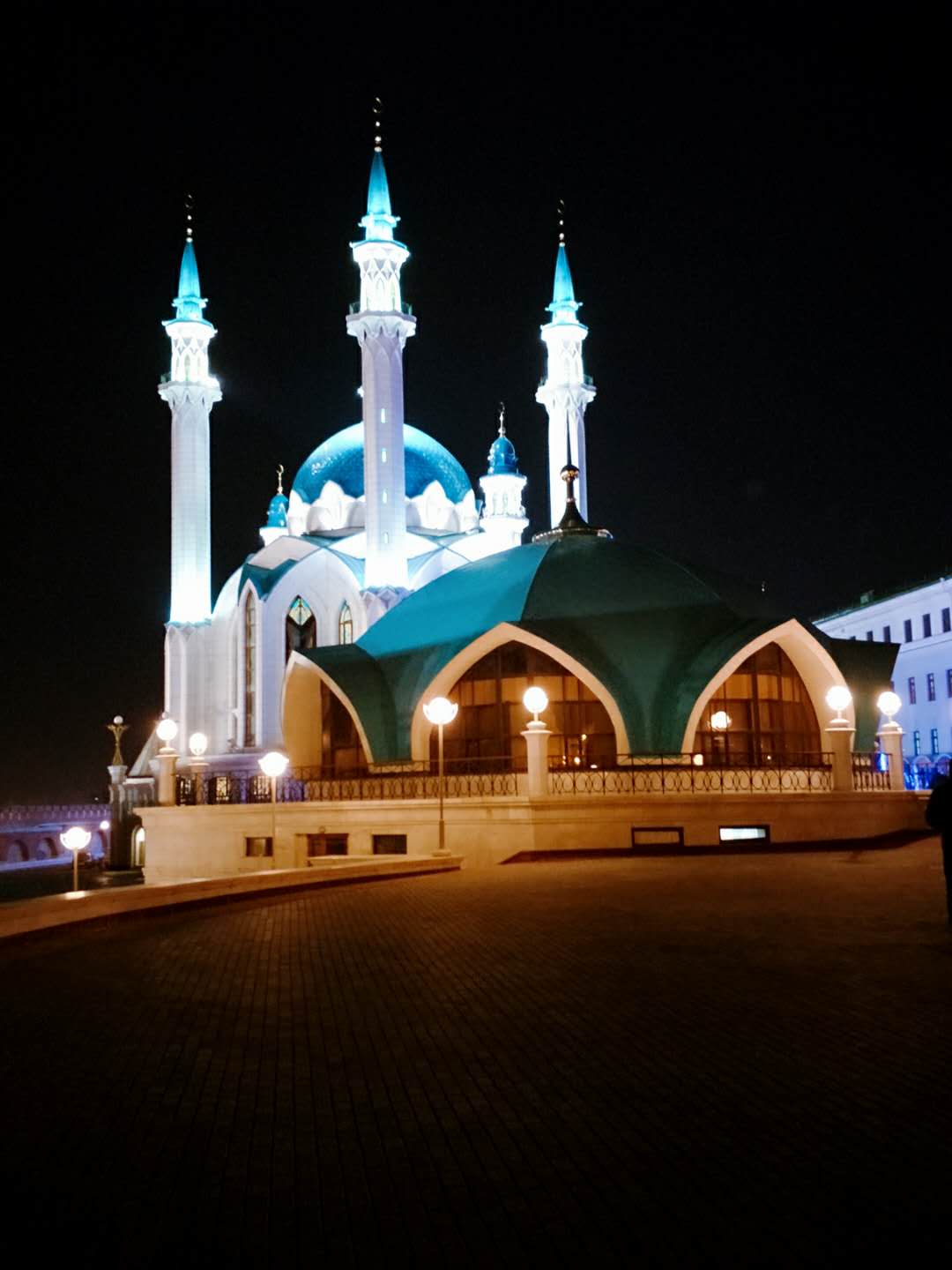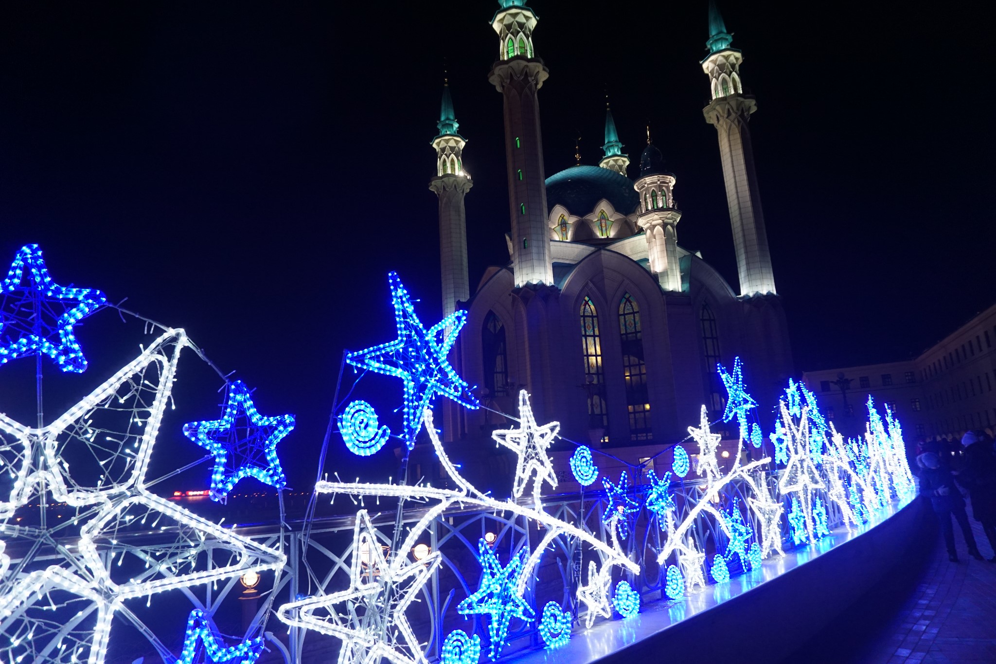 因为新年,清真寺周围加了很多装饰,好漂亮,特别喜欢这个清真寺,结合了伊斯兰风格和东正教建筑的风格,两个宗教的标志、建筑特点在这个建筑上体现的实在很完美,这个建筑就像喀山这个城市,一个具有包容性的城市。
