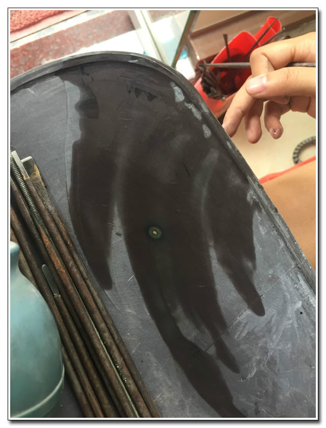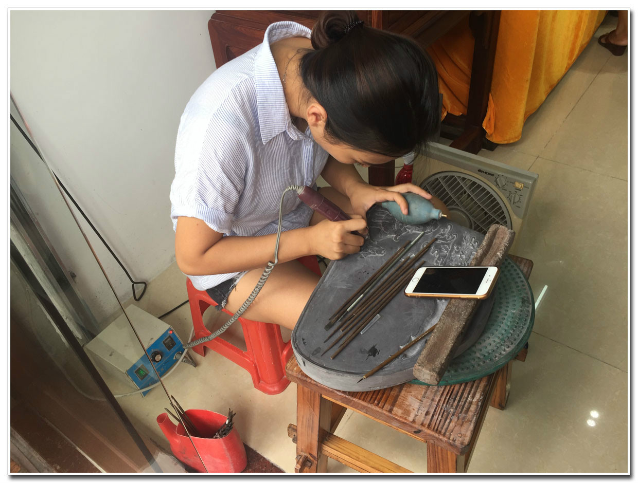 在一家店的门口,一位20岁上下的女孩子坐在店门口雕刻着砚台,这位姑娘很开朗,我和她聊了一会儿,她给我科普了些端砚的基本常识,上图那张有麻子的砚台质量更好些,这麻子要在水湿后更明显些。