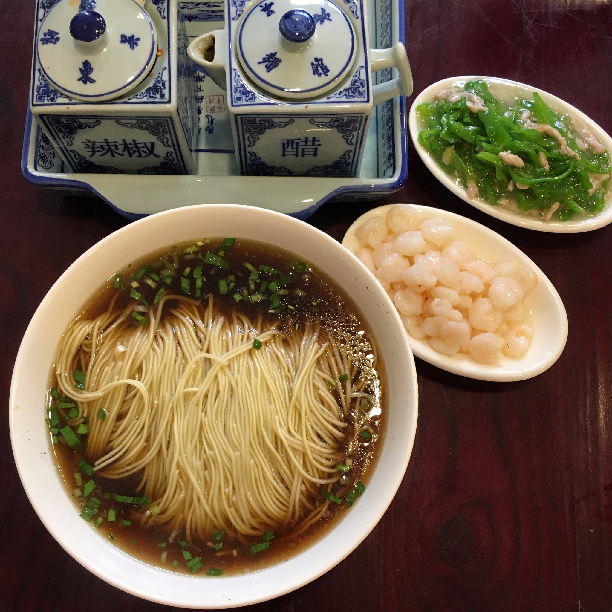 南京的面条都比较细也很清淡,跟重庆小面的重口味比起来差距略大。而且点的是虾仁面,但虾仁都是单独一个碟子装着的,比较不一样。