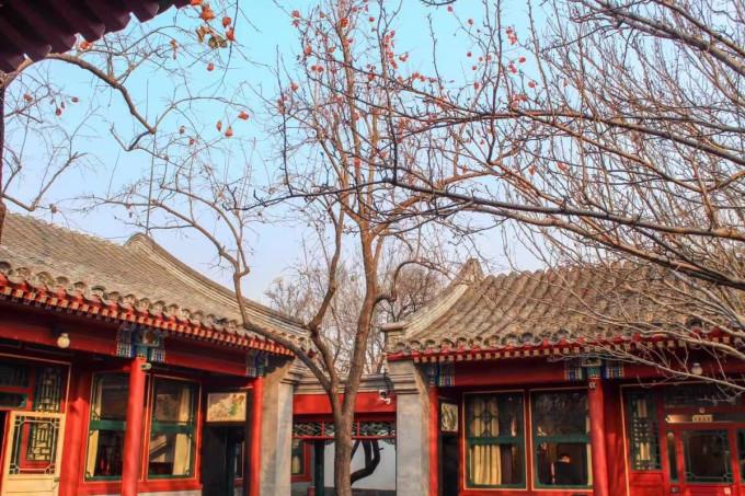 护国寺街9号。院落清幽,正院里柿子正红,有道是“事事平安”。朱红影壁后有四个云纹小石墩,摆花用的,一尊狮子盘踞的石池,养鱼用的。如今鱼和花都没了,狮纹池也圈起来了,只剩远远传来的阵阵鸟鸣。