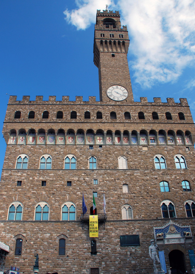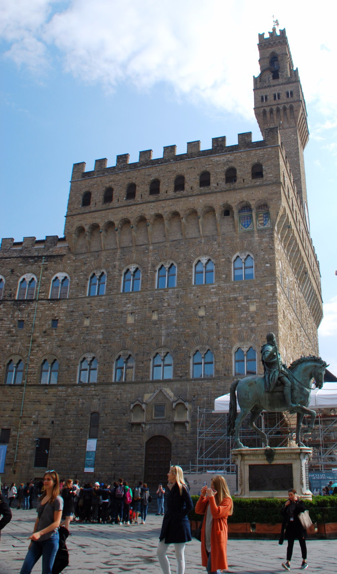 市政厅广场上的行政中心老宫,是美第奇家族的旧府邸。由阿诺尔福·迪坎比奥于13世纪末设计,是佛罗伦萨中世纪的典型建筑。美第奇家族执政后,他们的御用建筑师瓦萨里对“城堡”进行了大量的改造,揉进了文艺复兴风格。