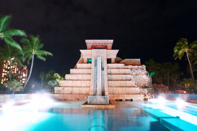 Power Tower 里也藏着三个Slides,在塔下拿上游泳圈爬到塔顶,可以坐着游泳圈乘坐下图的Slides,也是我非常喜欢的一个,坐了两次,在塔顶等待着下去的时候,可以俯瞰整个酒店,有一种自己坐着游泳圈就要冲入大海的感觉。也可以选择不爬到塔顶,塔中间就坐上游泳圈下去。还有一个Slides也在塔顶,没有游泳圈,在黑暗中直接冲进未知地方,但也有一种垂直下落的感觉。
