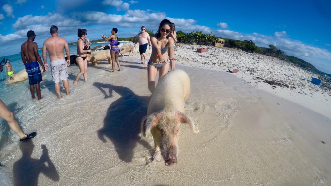 最先到的就是所有人最期待的猪岛了,这个红遍国内微博的小岛,被万人羡慕的猪,但实际上并不是可爱的小香猪,除了一只小猪,其他都很大只,向我游来的时候还有些吓人。船长会分发热狗让我们喂,但还是小心,比如我就不小心被其中一只猪蹬了一脚,以及在被猪追的时候滑破了脚