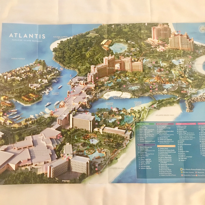 办理入住的时候,前台会给你一张酒店地图,以及当天酒店营业的餐厅,餐厅的介绍以及价位。通过地图就可知整个酒店有多大。花个三天玩酒店真的一点都不为过,除了亚特兰蒂斯最著名的水上乐园,走到哪里都有的各式各样的游泳池,私人海滩,贯穿整个酒店的海洋馆都是酒店住户可以免费畅玩的,除此之外还可以花钱预定海上项目,比如摩托艇,帆船,滑翔伞等,还有浮潜,与海豚鲨鱼互动等,也有赌场和购物的地方。