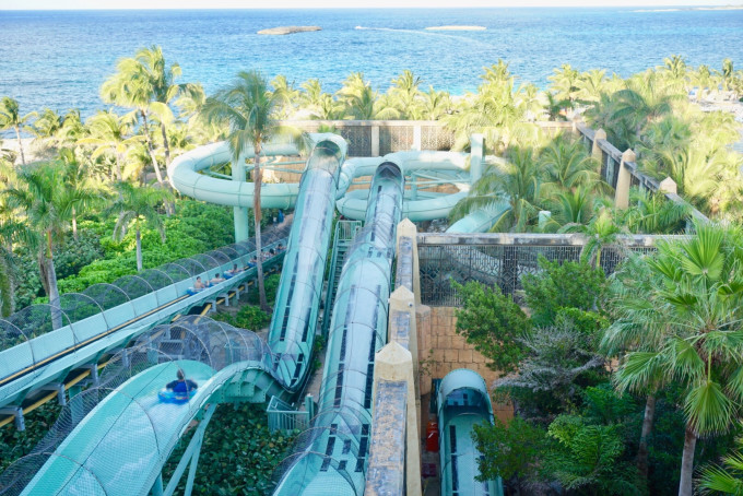 这个塔除了水上项目,也是个俯瞰亚特兰蒂斯全景的好地方。除了各式各样的slides,水上乐园里还有两条漂流河lazy river 和rapid river。就像名字一样,lazy river就顺着水流慢慢晃悠,rapid river则会有人造浪,更加刺激。