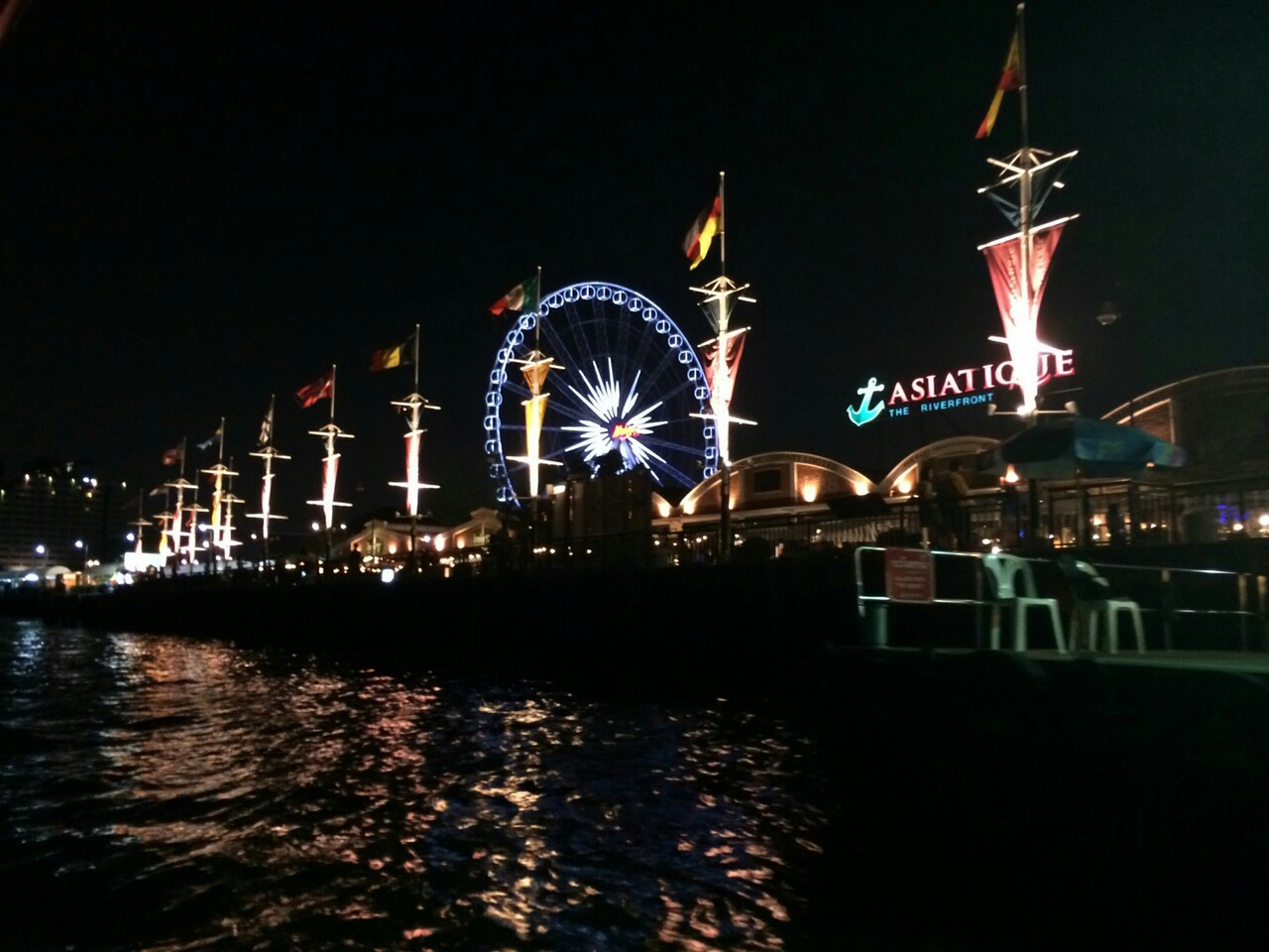 (这里需要注意的是不要走进蓝色的亭子售票厅里,是亭子左测,挨着墙的小道哦,而且河滨夜市的船的船头除了国庆没有其他颜色的棋子,船上写着ASIATIOUE THE RIVERFRONT就是河滨夜市的英文名,因为你在谷歌地图导航是只能识别英文地址)然后在夜市吃吃吃~逛逛逛~码头吹吹风,挺惬意的,返回也是一样的,在码头一号亭子哈,我们回去的时候就看到有队伍去排队的~幸好有一个小姐姐提示我们~~