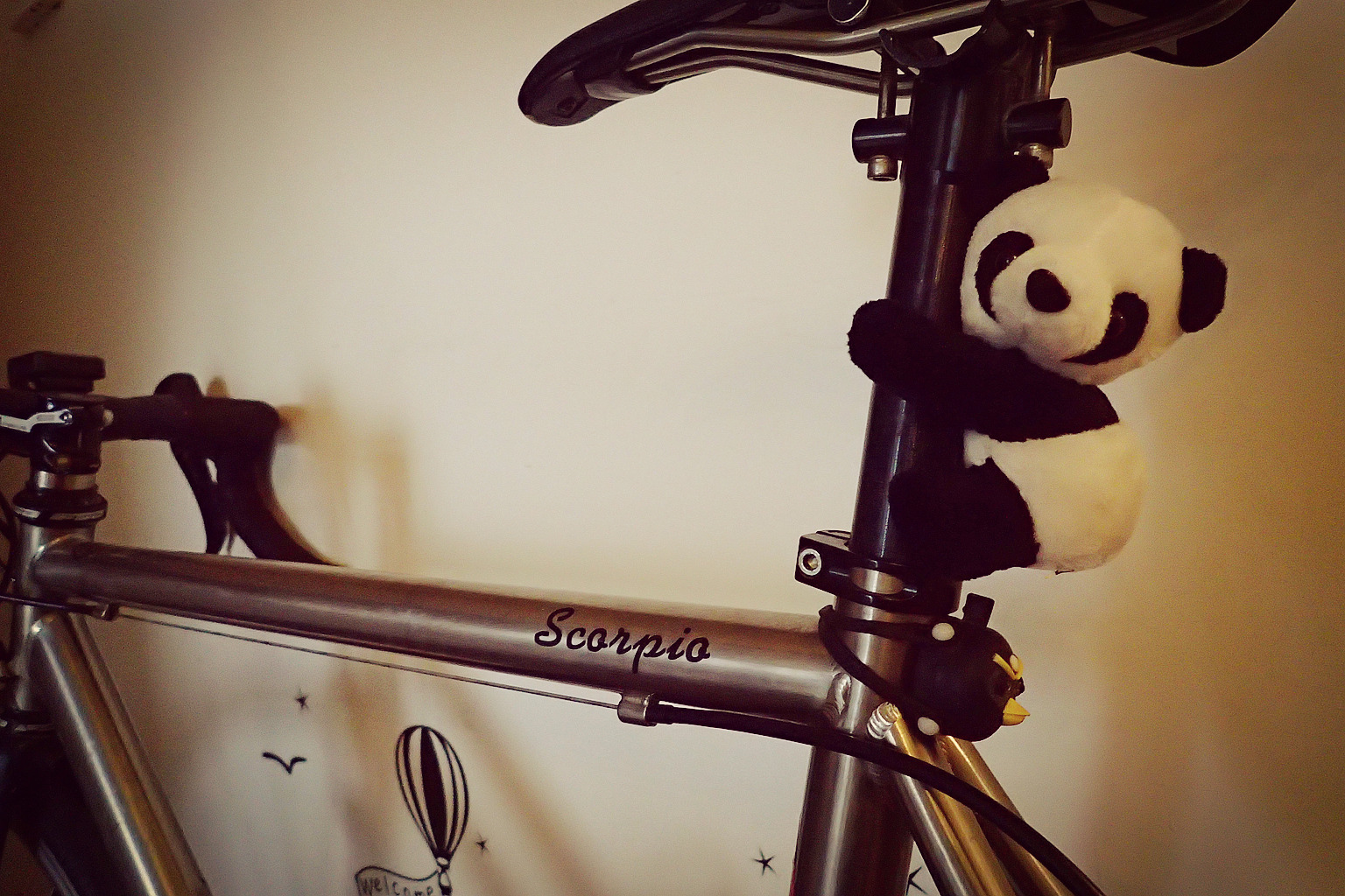 放自行车上的物品清单:手电筒1个,尾灯1个,熊猫滚滚2个,山狗1个,视频机位1个