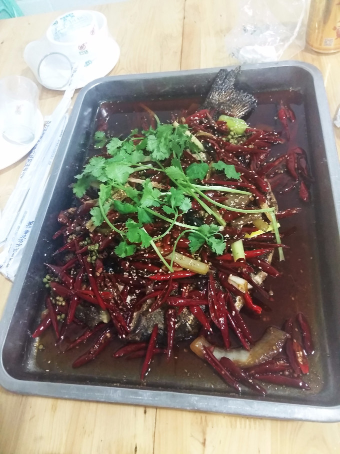 因为不是很喜欢吃鱼,只是想尝尝味道,两个人点了一条偏小的鱼。别看只有简单的盘子装着,味道确实很巴适,香辣味足,烤的也很入味,外焦里嫩,来吃的人也很多,因为边吃边聊天,周围的人都换了几波,座位就没空过。