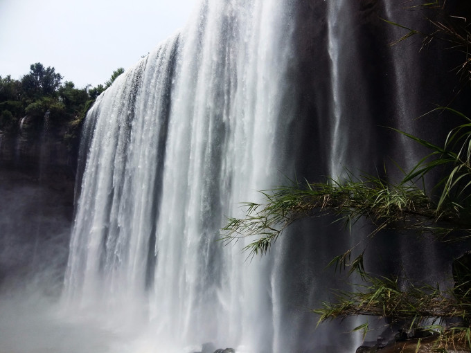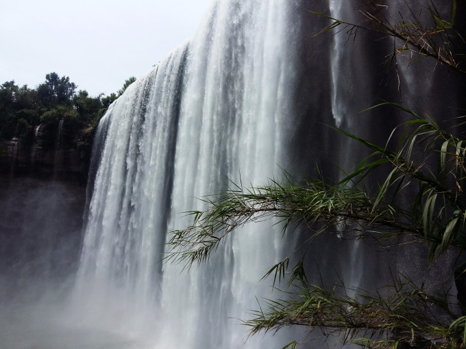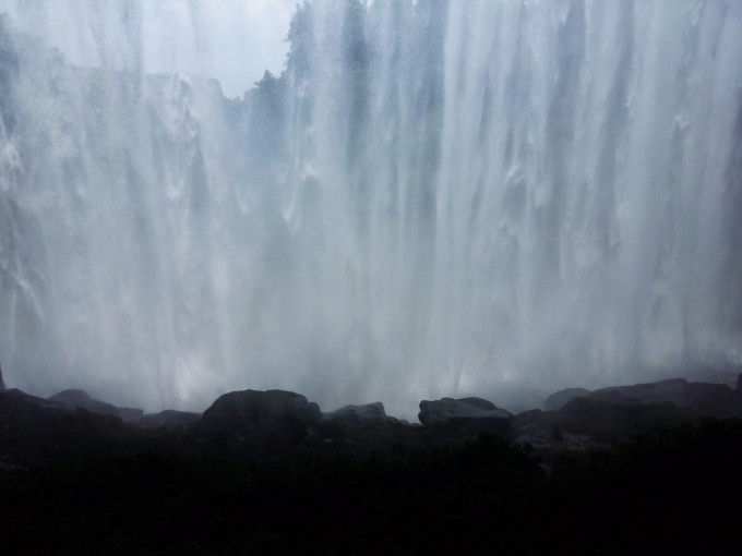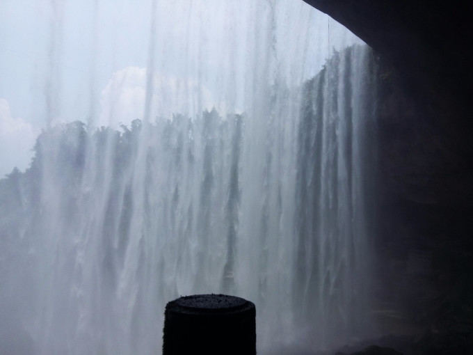 从正面看以为瀑布景区很小,其实里面别有洞天。首先这个水帘洞就特别好玩。上岸到水帘洞还要走一段,越靠近还需要撑伞,不是为了太阳,而是为了遮水雾,如果不撑伞不一会衣服就会浸湿了。下面这个就是近距离接触瀑布啦,感觉触手可及,十分壮观。