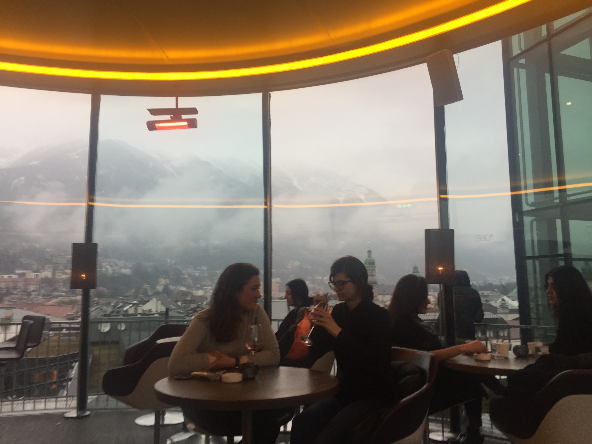 逛了一小会发现没什么好逛的(哈哈恕我直言下雨天的因斯布鲁克不怎么美)我们决定去被奥地利留学的同学安利过的全景咖啡店--bar 360喝一杯咖啡休息休息~ bar 360在一个商场里面的顶楼(google可以搜到商场,进去之后找电梯就可以看到到顶层的按钮)里面人很多,几乎都是当地人。咖啡还可以,环境更甚一筹~只是如果当时天晴的话就更好了...