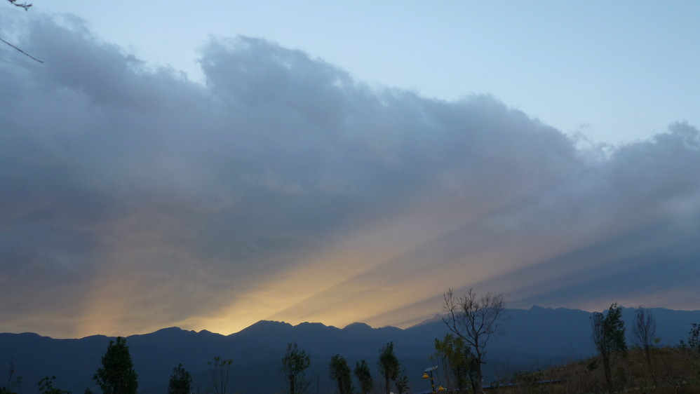 一路上一直观察着天空的变化。慢慢的一束光变成很多束、光束像是从山中射出来一样,很美。