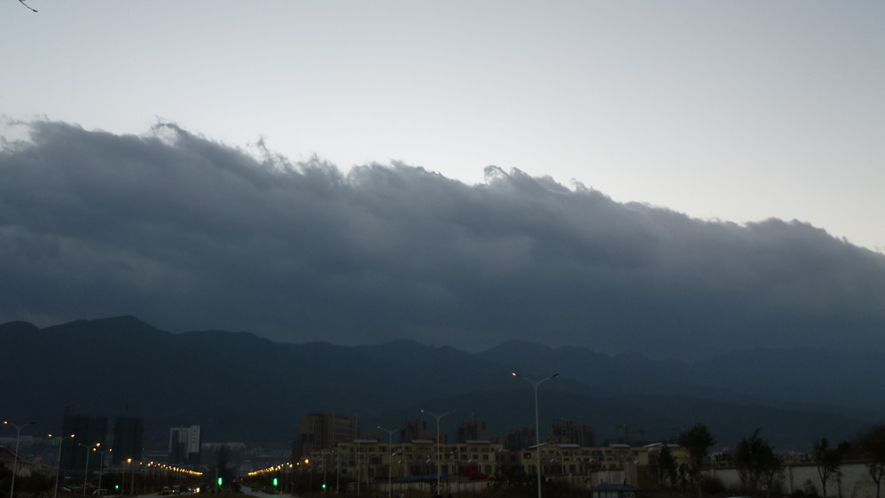 天越来越晚了。这天、这云、这山融在一起,真的很像一幅水墨画。
