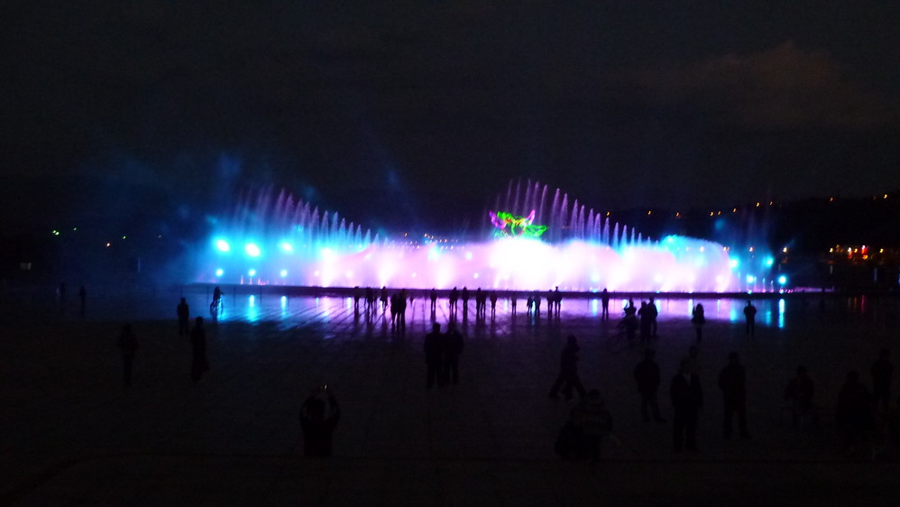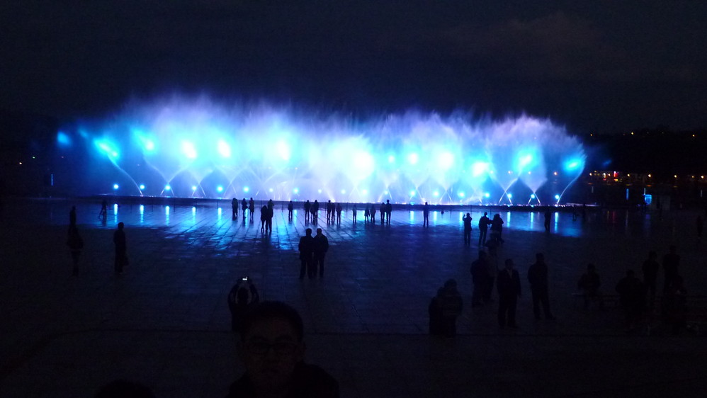 看着这音乐喷泉,我们都激动了。风很大,音乐声也大~