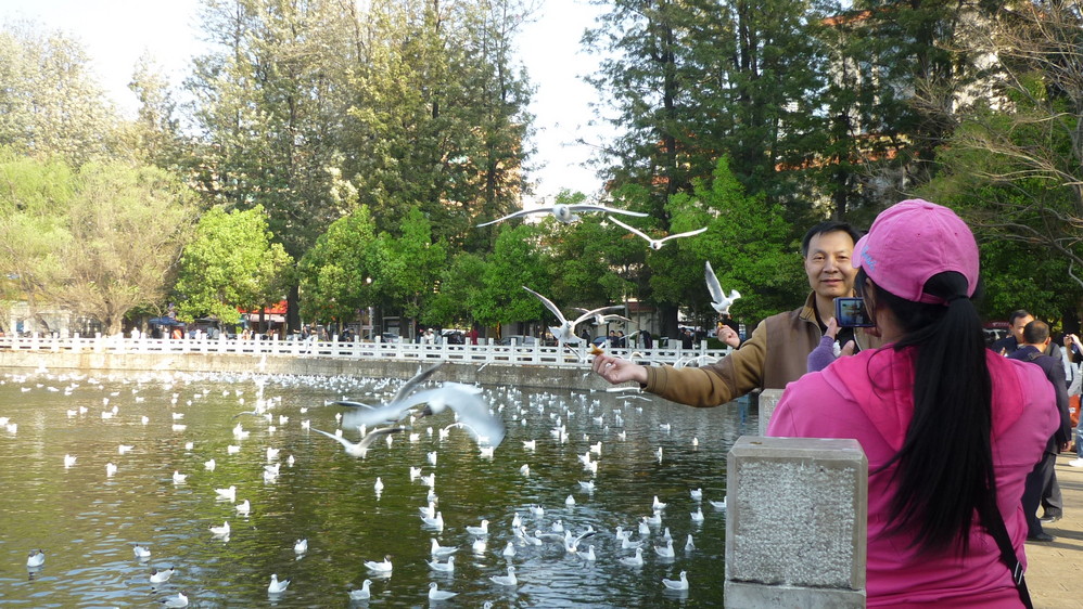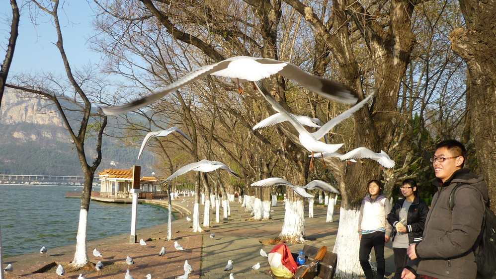 我们在滇池旁边给红嘴鸥喂食,它们都不怕人,给它们喂食要用扔的,它们不吃手上拿着的食物。很有意思。