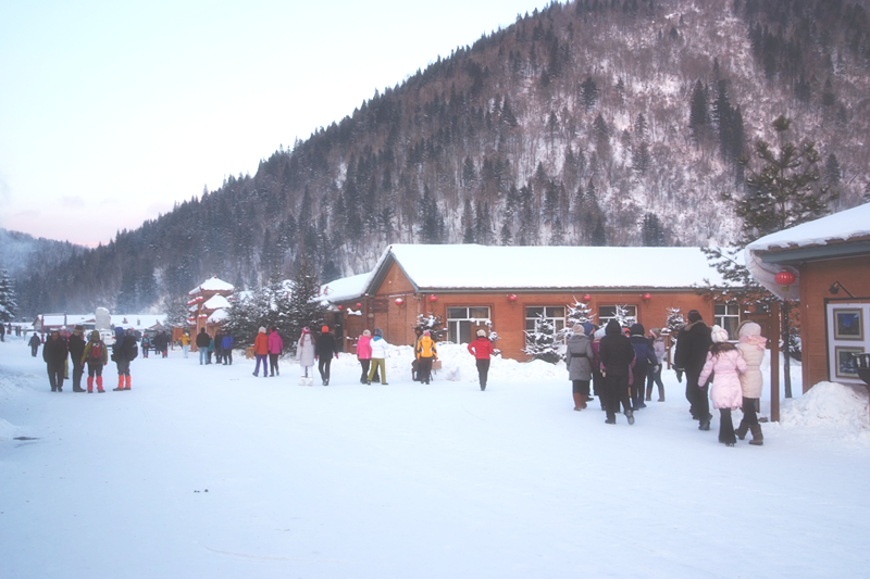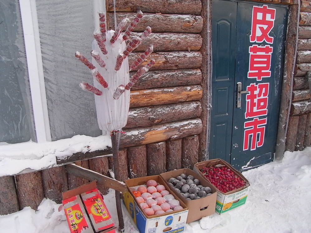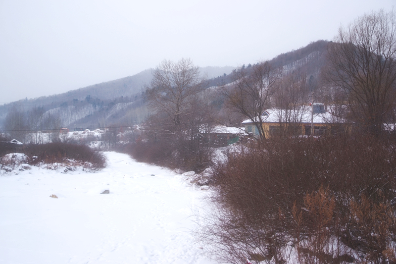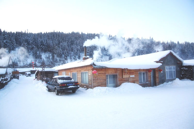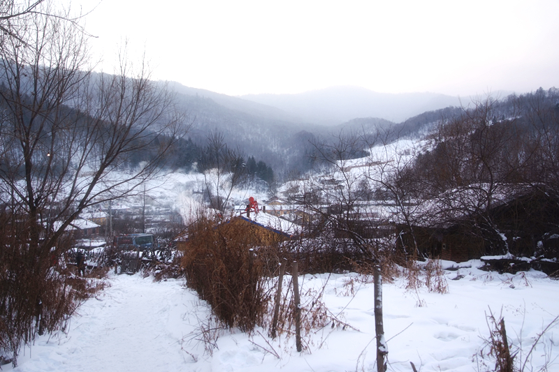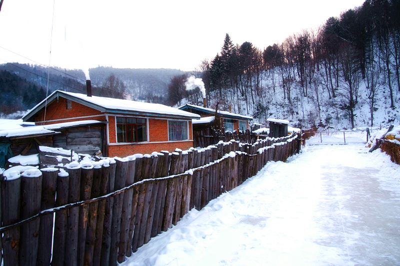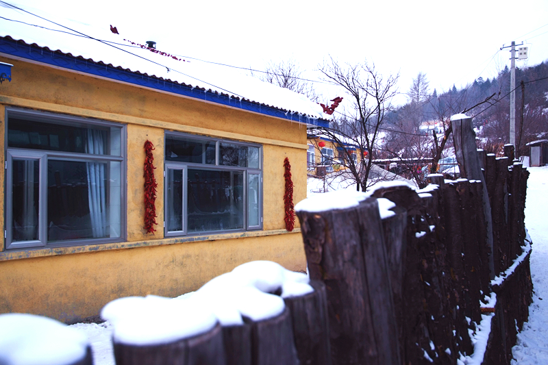 第二天一早准备好行装,我们带上行李下楼车停在宾馆门口,是一辆20人的中巴我们一行11人上车落座。汽车穿城而出延动力区向五常方向驶去,路边是白茫茫的积雪,经过近5小时来到一个岔路口,在这里休息片刻,中巴继续驶往东升林场,又经过近一小时前面出现一个横幅,中国雪谷,我想东升到了,下车后领队安排房间,基本都是5人一间比较拥挤的出发前我们特意订了2人的包间但是要多花RMB100(现在看来值得的)房间感到很温暖,床铺都睡在炕上面的,房东很热情的接待了我们,整理还装备后到外面瞎逛看到东北特有的冻梨、冻柿子,