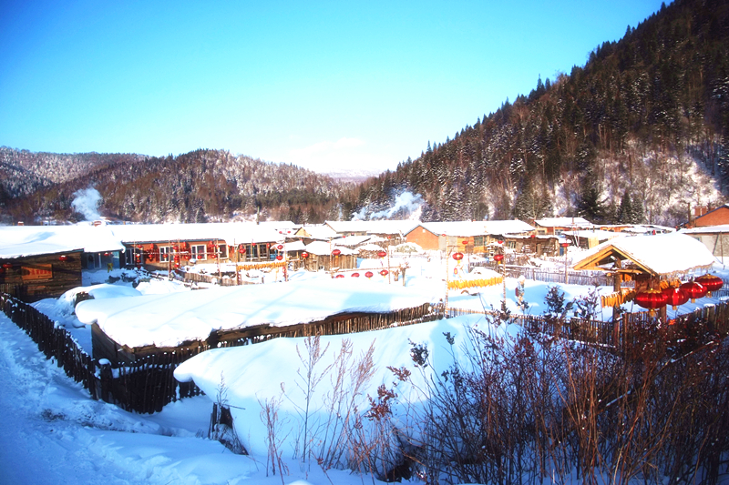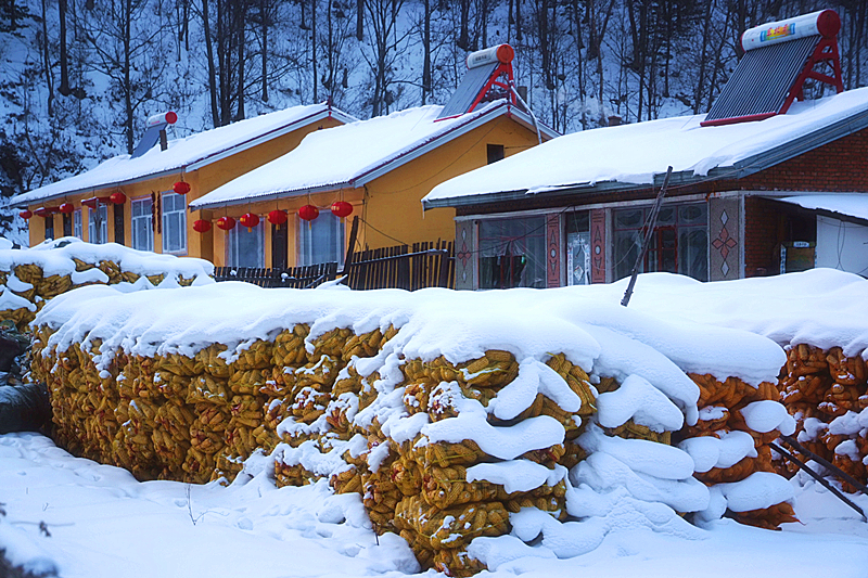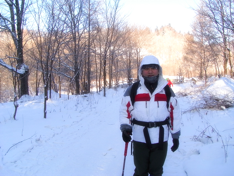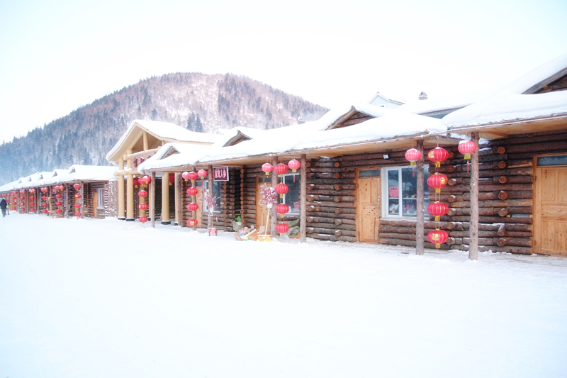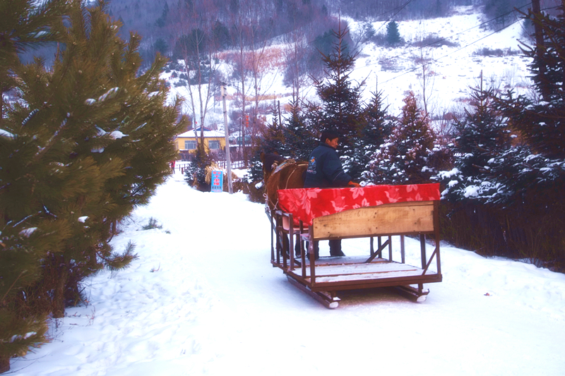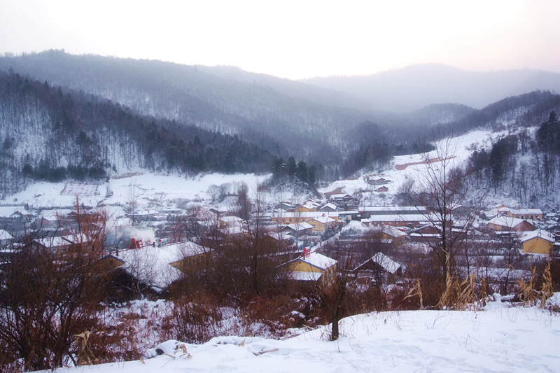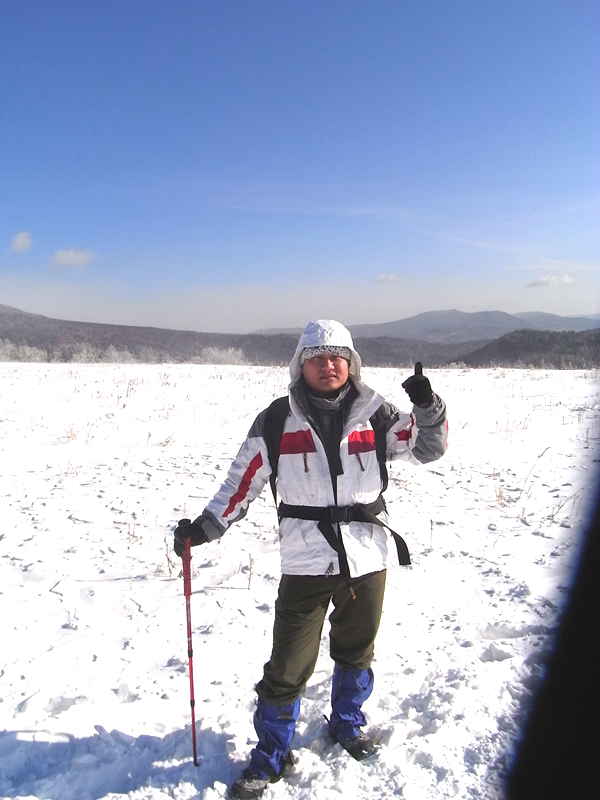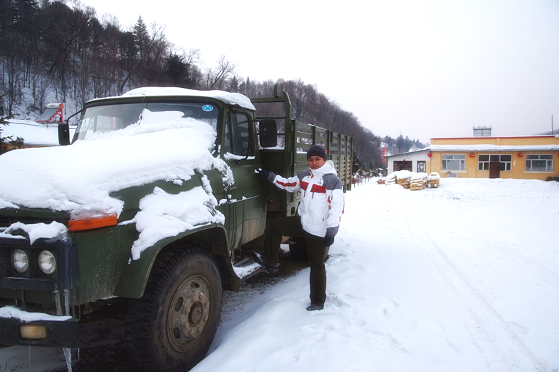 第二天一早准备好行装,我们带上行李下楼车停在宾馆门口,是一辆20人的中巴我们一行11人上车落座。汽车穿城而出延动力区向五常方向驶去,路边是白茫茫的积雪,经过近5小时来到一个岔路口,在这里休息片刻,中巴继续驶往东升林场,又经过近一小时前面出现一个横幅,中国雪谷,我想东升到了,下车后领队安排房间,基本都是5人一间比较拥挤的出发前我们特意订了2人的包间但是要多花RMB100(现在看来值得的)房间感到很温暖,床铺都睡在炕上面的,房东很热情的接待了我们,整理还装备后到外面瞎逛看到东北特有的冻梨、冻柿子,