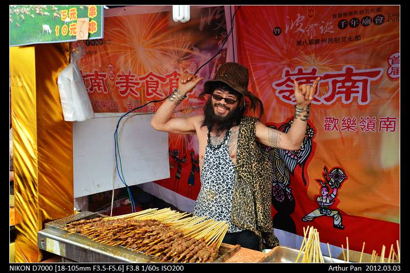 一个烤羊肉串的大哥特有激情,一遍伴着音乐跳舞,一遍烤串。